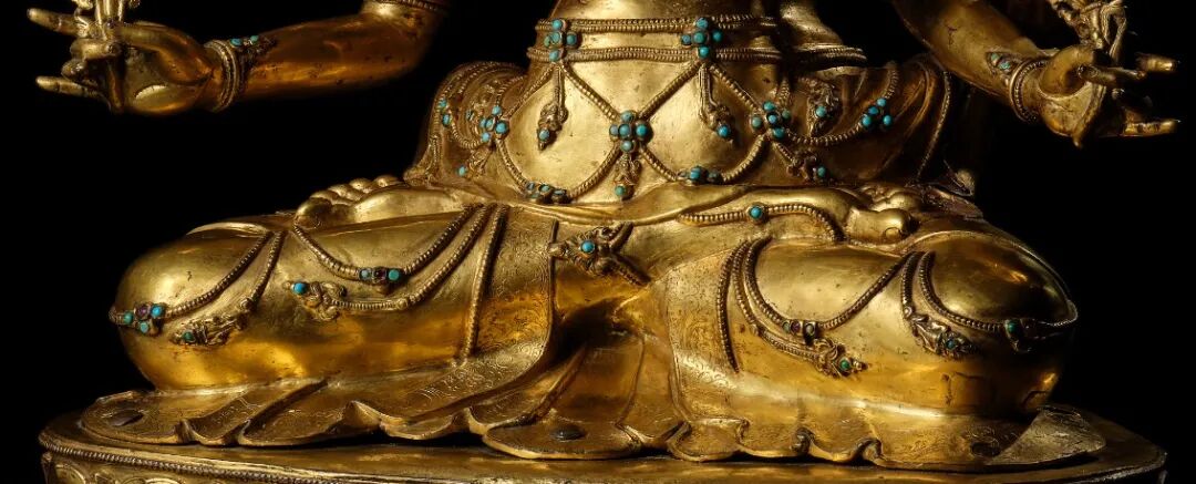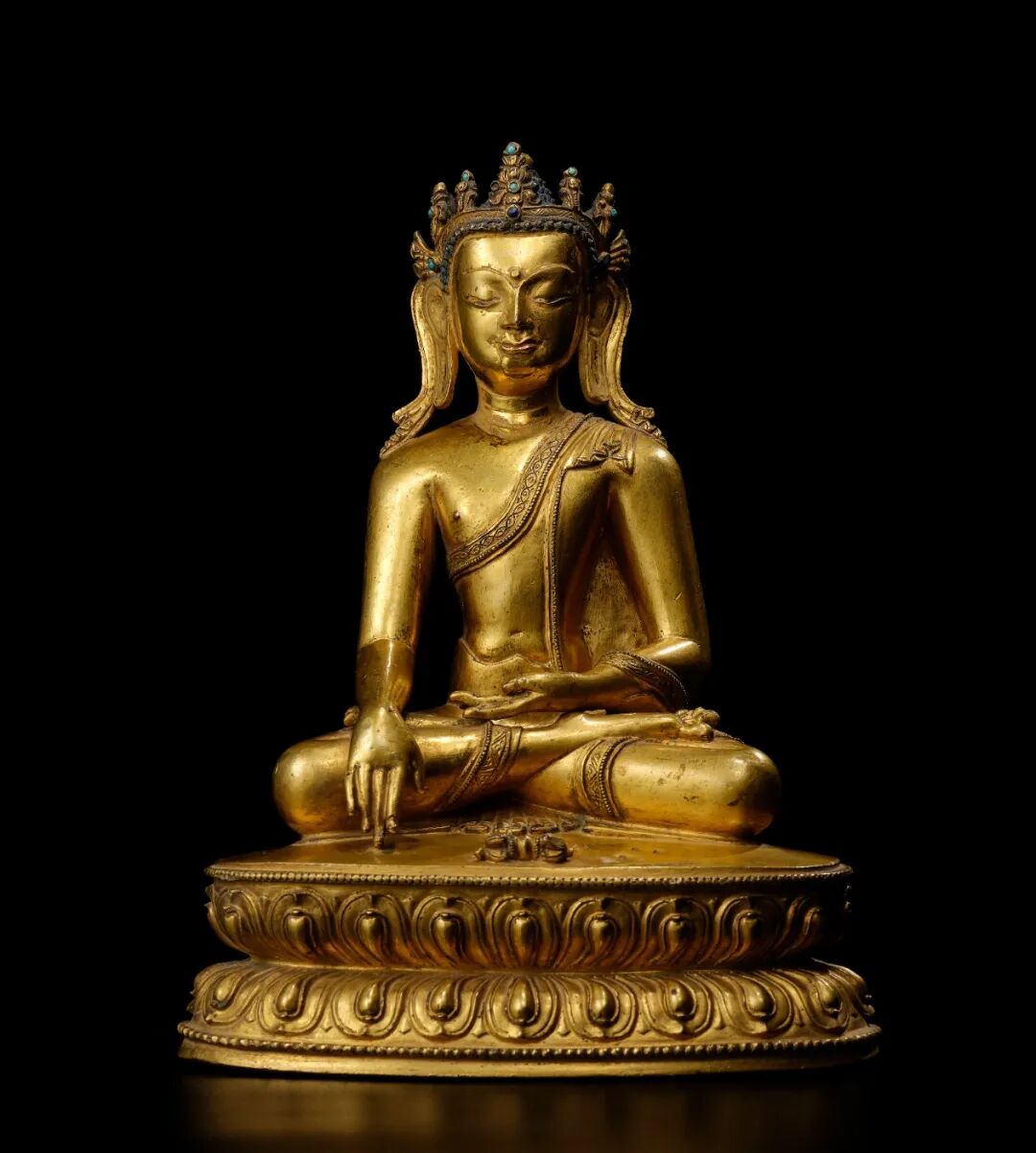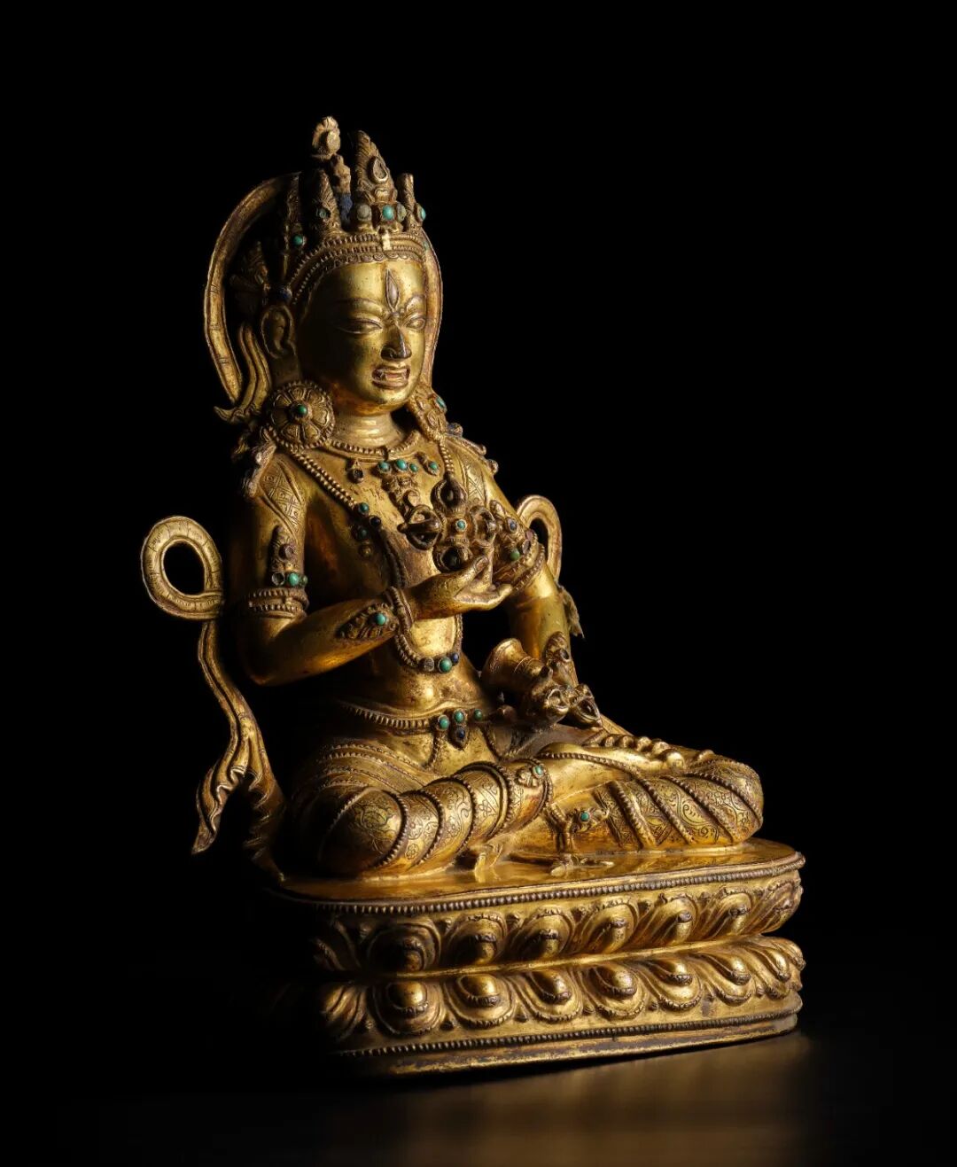 造像鎏金明亮润泽,莲座前方花瓣大开,后侧却留白并漆红,正为古老的卡萨马拉王国造像之独特风格。此王国曾于十三至十四世纪之间统治尼泊尔及西藏西部,如今已荡然无存,仅有数尊造像留传。![]()