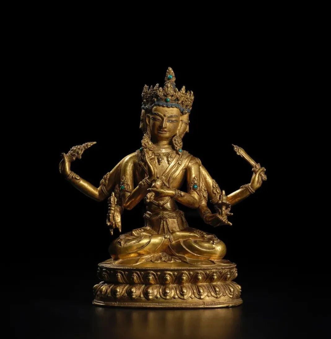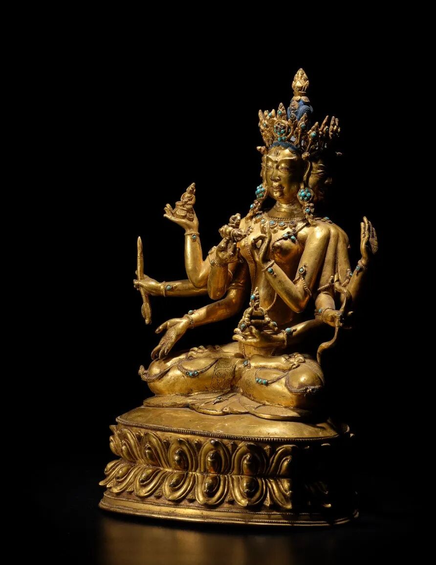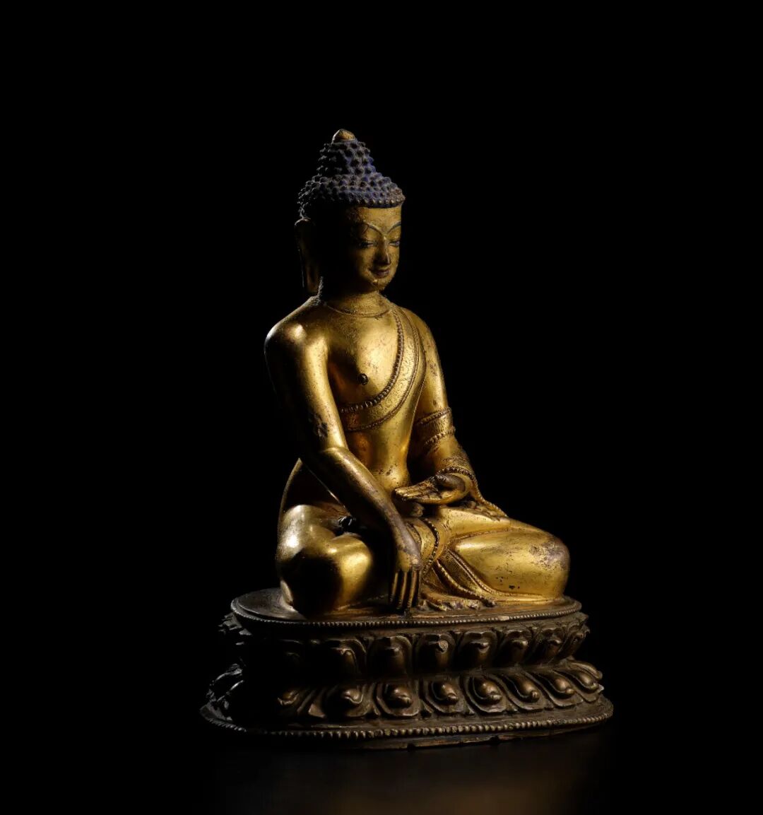 造像鎏金明亮润泽,莲座前方花瓣大开,后侧却留白并漆红,正为古老的卡萨马拉王国造像之独特风格。此王国曾于十三至十四世纪之间统治尼泊尔及西藏西部,如今已荡然无存,仅有数尊造像留传。![]()