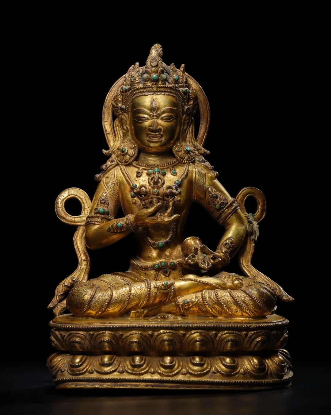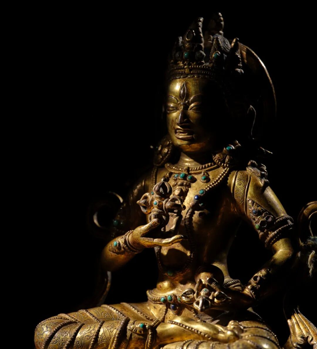 这尊罕见的神祇手持十字金刚杵及金刚铃,正为摧破金刚,可消除修密者不洁与疾病,摧破一切障碍、恶业与衰败。其双眼圆瞪,气势撼人。此铜像鎏金厚重而华美,镶嵌绿松石,身形圆润柔和,体现出尼泊尔造像之影响,为丹萨替寺庙之典型风格。![]()