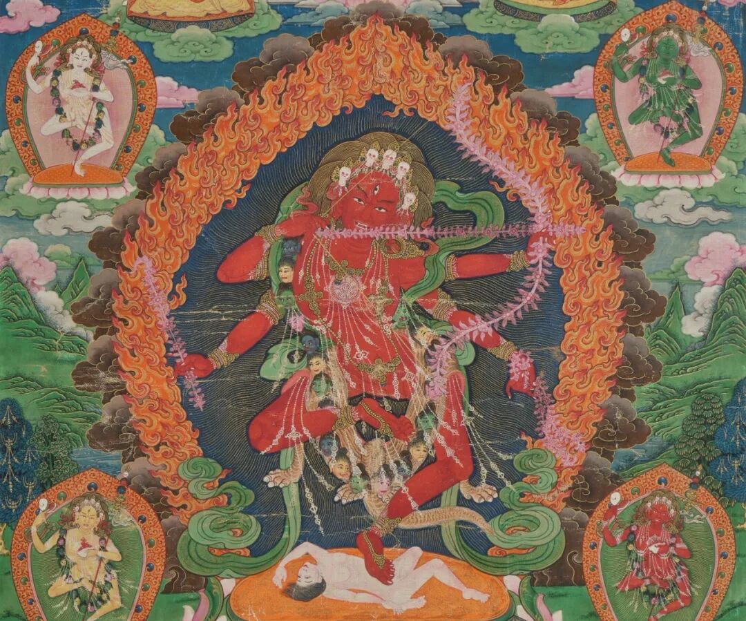 《秘密集会怛特罗》在西藏被尊称为「怛特罗之王」,正是此尊造像所呈现之文本。此怛特罗约于750年至850年间成书于印度,并于11世纪时译为汉文与藏文。《秘密集会怛特罗》被认为是第一部由释尊所授之怛特罗,为《无上瑜伽怛特罗》之根本文本。![]()
