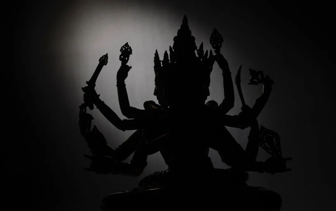 尊胜佛母神情慈悲,姿态柔和,三面八臂,各持法器或施手印,赐予信众长寿平安。主臂持十字金刚杵,象征力量坚不可摧。其余手臂左右呼应,右侧持无量光佛、象征智慧之箭及予愿印,左侧则持象征无量光佛化身之无量寿佛之宝瓶、象征慈悲之弓及无畏印。