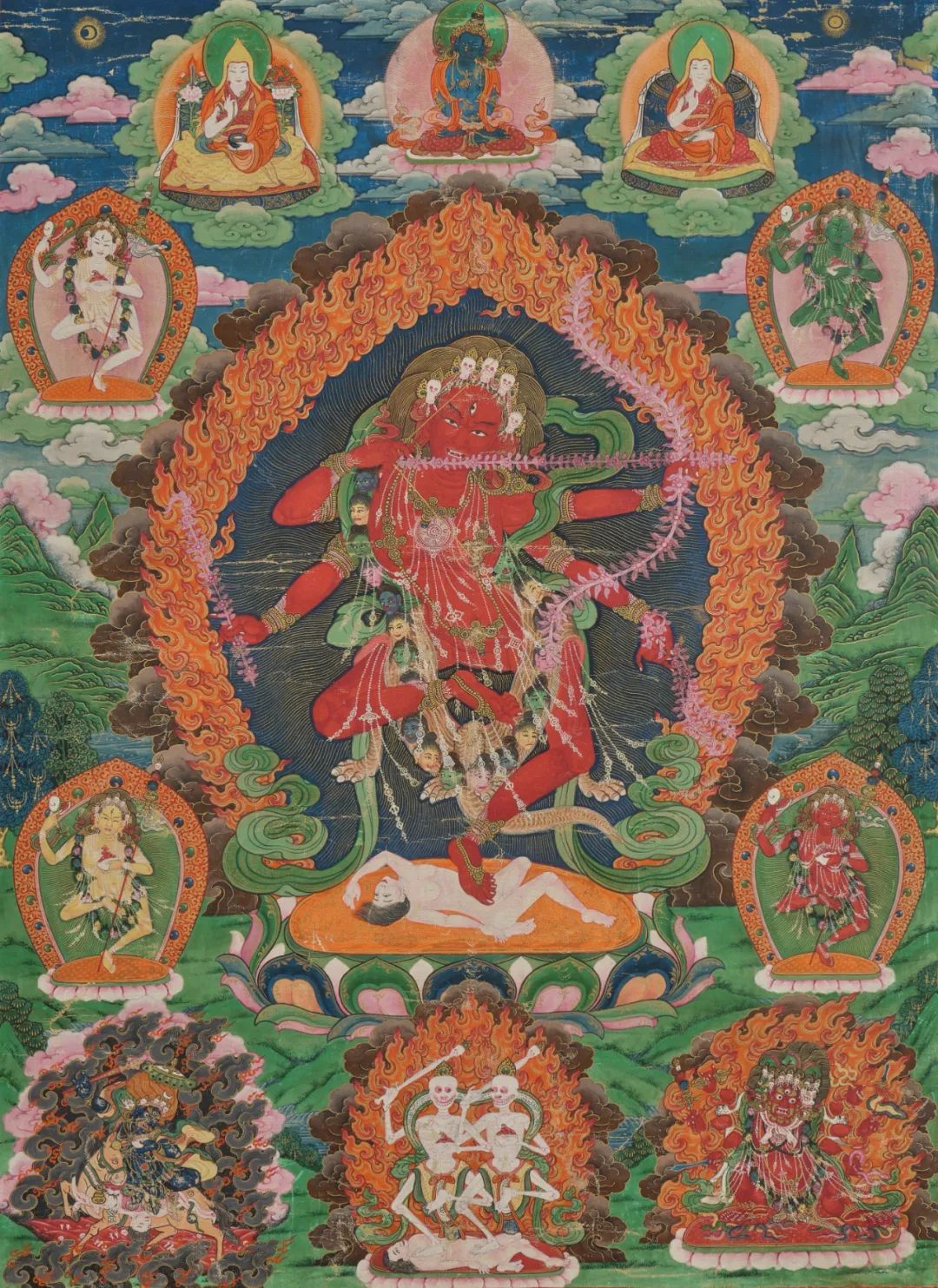 来源:克劳德·德·马图珍藏,布鲁塞尔,二十世纪七十年代前入藏此张唐卡之画工极为精湛,设色明丽而和谐,神祇之殊胜与山水之优美交相辉映,无比夺目。智行佛母出自喜金刚密续,与十二臂红象鼻天及欲帝明王被尊为「大红三尊」,皆属萨迦「十三金法」。佛母采舞立姿,身披华美璎珞,手持花弓、花箭、花钩及花索,满弓将射,扫除无明与灾祸。![]()