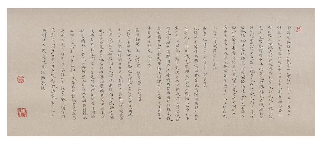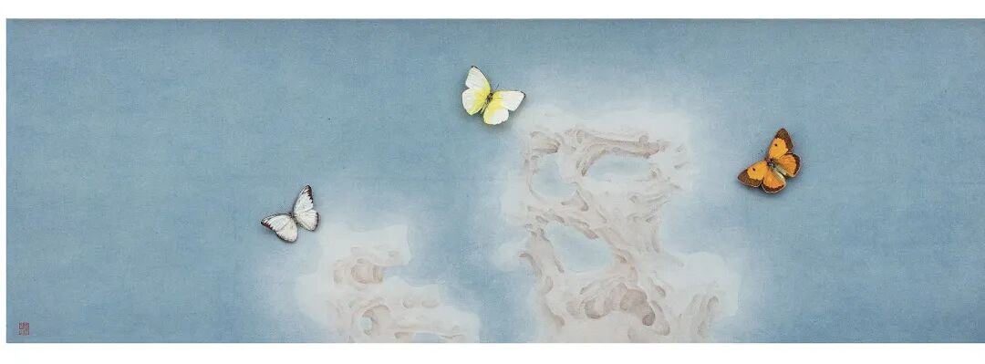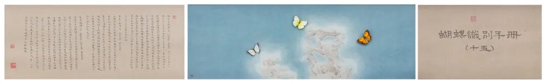 “从视觉上看,《蝴蝶识别手册》是非常传统的,因为无论是太湖石还是蝴蝶,都是传统中经常出现的图式。但是我用真实的蝴蝶标本与绘画的太湖石并置,形成了物与形式的一种新关系。在题跋区,我用书法的形式抄写了画面中每一只蝴蝶标本的科普知识。观者可能从视觉的第一判断中,认为这是一件传统的绘画作品,因为里面有引首,题跋与画面。但当观者意识到作品中的蝴蝶是真实标本时,就会对作品的绘画属性产生疑惑。而当他完整的阅读完题跋区的科普知识时,就会对这件作品的传统属性做出完全不同的认知体验:一方面,从形式的角度来看,《蝴蝶识别手册》无疑是特别东方的视觉形式;而另一方面,也可以理解这是借助传统形式,设计出的一个蝴蝶标本柜。在这种矛盾的视觉体验中,我试图讨论绘画与物质之间的边界问题。因为现成品的引入,也自然使我的艺术创作,进入到绘画的平面性与物质的空间性之间的讨论。”