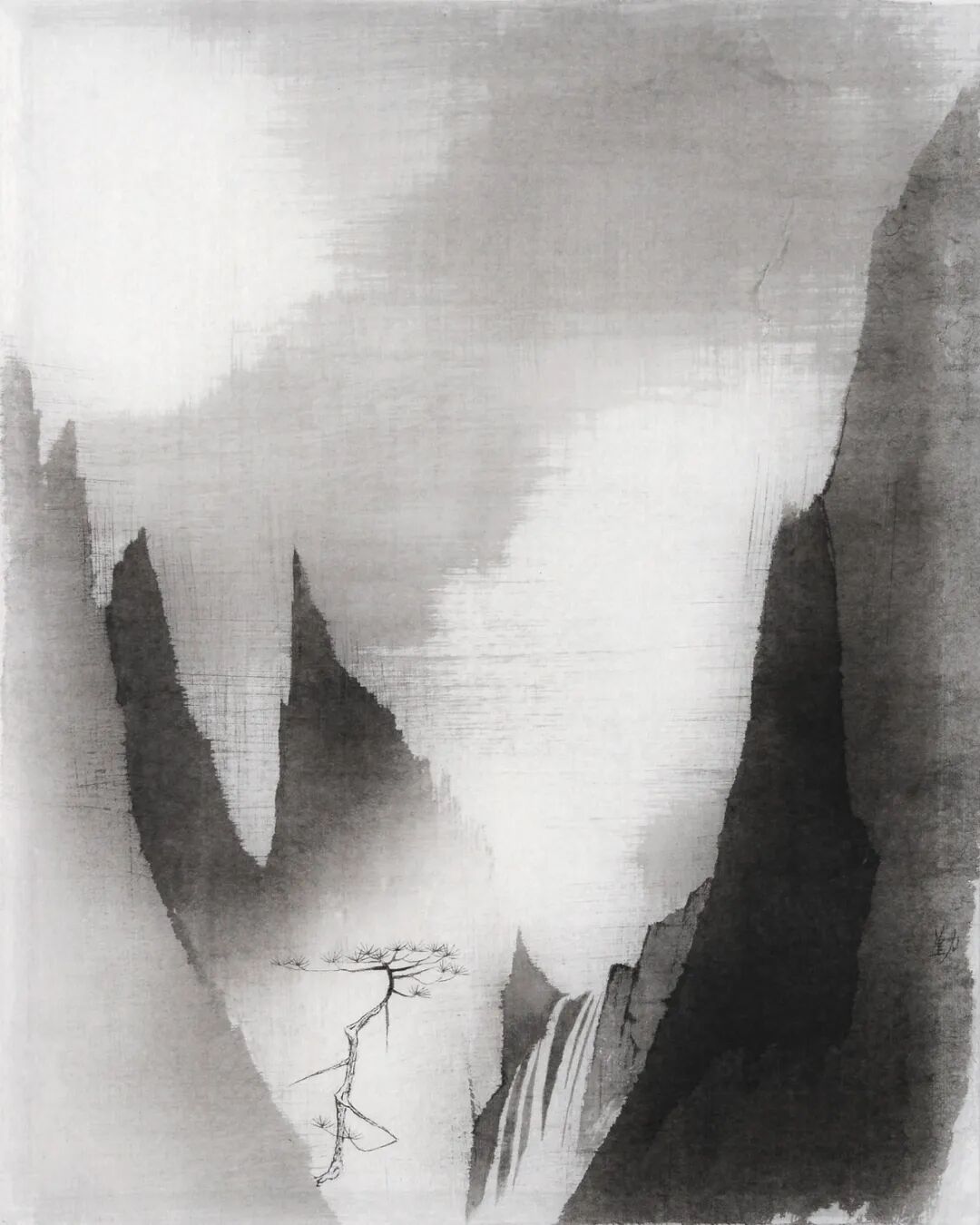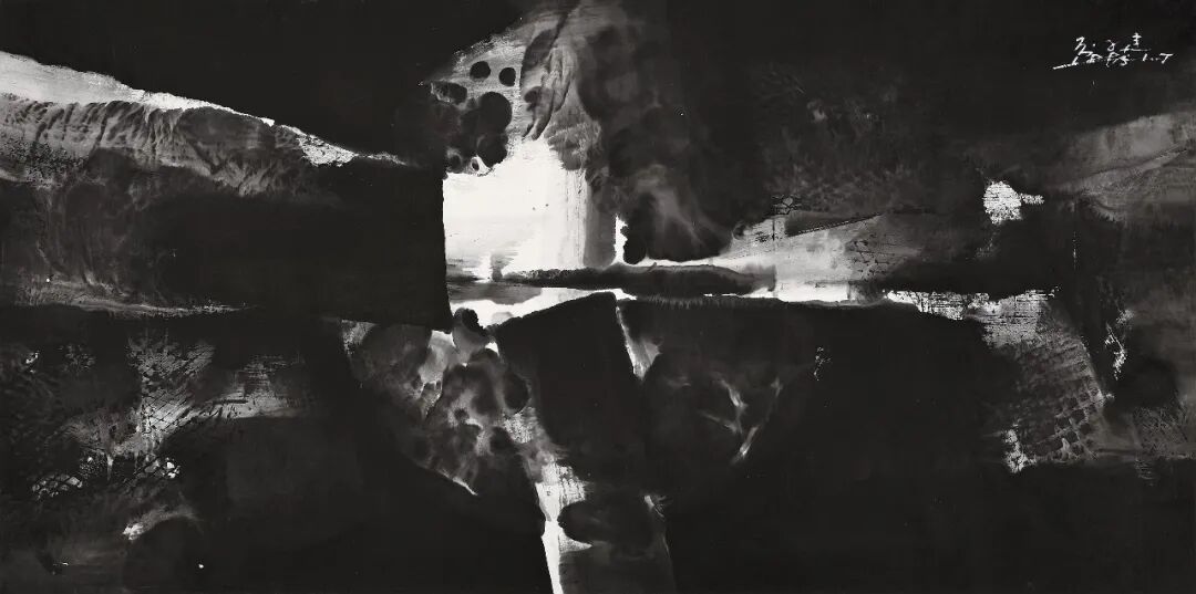 王绍强的水墨艺术亦是一种意象表达。在他的作品中,可见一些自然山水的丘壑之形,但並非自然山水的实景写照,他运用蒙太奇式的超现实手法造境,造的是浑沌初开、元气充盈的“远古”之境,也是神游八荒、心与物接的胸中之境。他的笔下生发起各种形态的山川意象,更营造出无边无垠的宇宙景象,一如庄子《逍遥游》所论述的自我与自然的关系:只有忘却物我的界限,无所依凭而游于无穷,这种“游”才超越了时空成为精神之游。