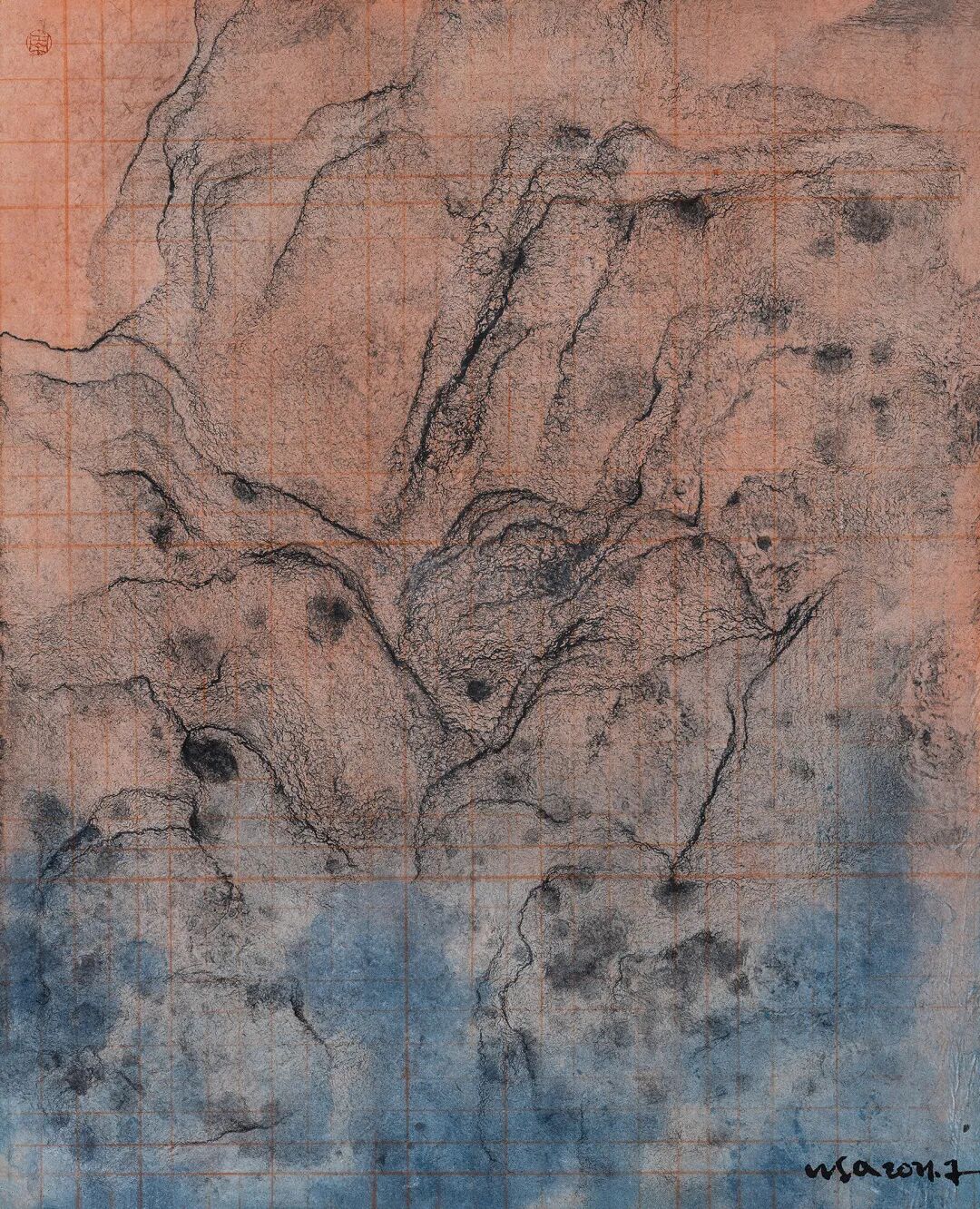 以崇山为坐标,以山石为颜料,田野调研式的考察与创作,成为了王绍强认识世界的手段,也渐而促成了他科学的自然观。星图、方格网、卫星地图标识、水墨材料、山水意象,这些是王绍强作品的关键词,也构成了其艺术风格的主要特征。基于对中西方艺术的理解,对当下艺术生态的观察,用今天的知识结构重新认识和选择传统文化资源,王绍强推演出一套自己的创作方法论:他循着抽象形态这个古今中西共通的元素,回溯到中华文明最初的几何图像系统“河图、洛书”,进而将“地图”的概念引入传统山水。