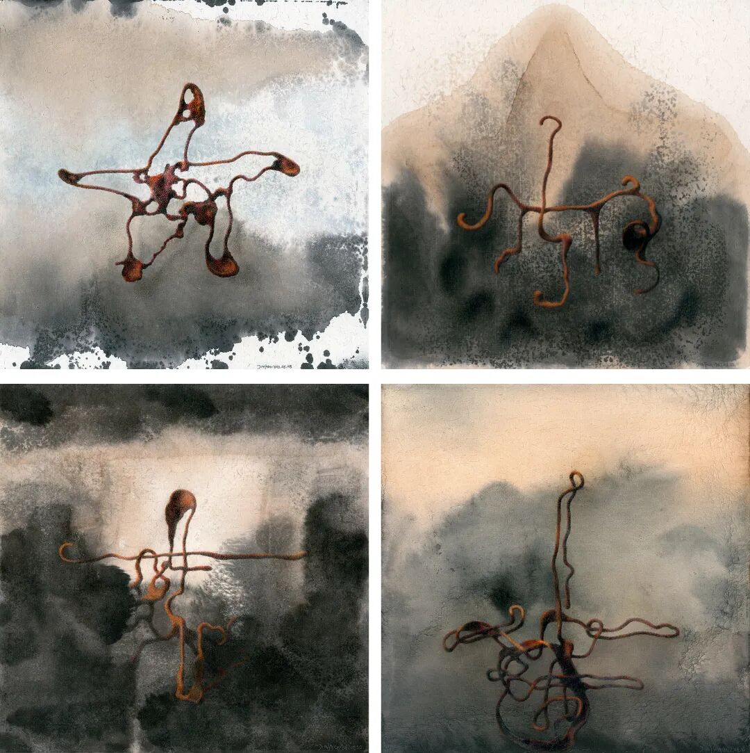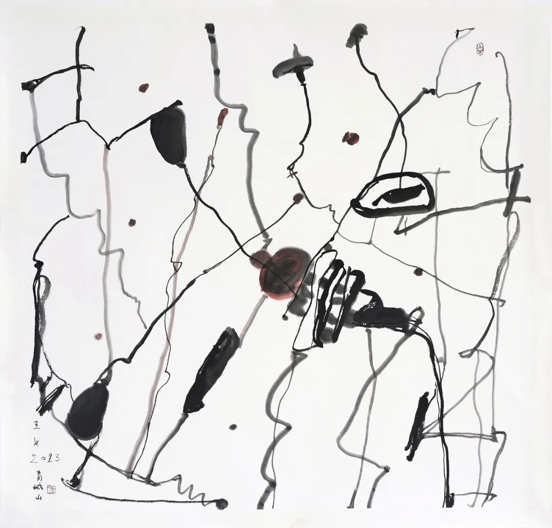 王川的抽象水墨作品是他在自我与外界的交戈之下诞生的产物。他早年从具象油画领域转型,通过水墨的抽象化,找到了一条既能窥见水墨当代性,又能让自己在画面之上打开心境的途径。通过长期的摸索和训练,在对点,线,面彻底地抽丝剥茧之间,他的笔触重点在于呈现自己纽结丰富的心象。在他的抽象水墨作品中,能感受到一股脱离病痛后自在逍遥的气量,那些令人晕眩的搅动式的点线组合,来自王川郁结而浪漫的本质。这种人生态度和水墨的交织是王川作品中独特美感的来源。