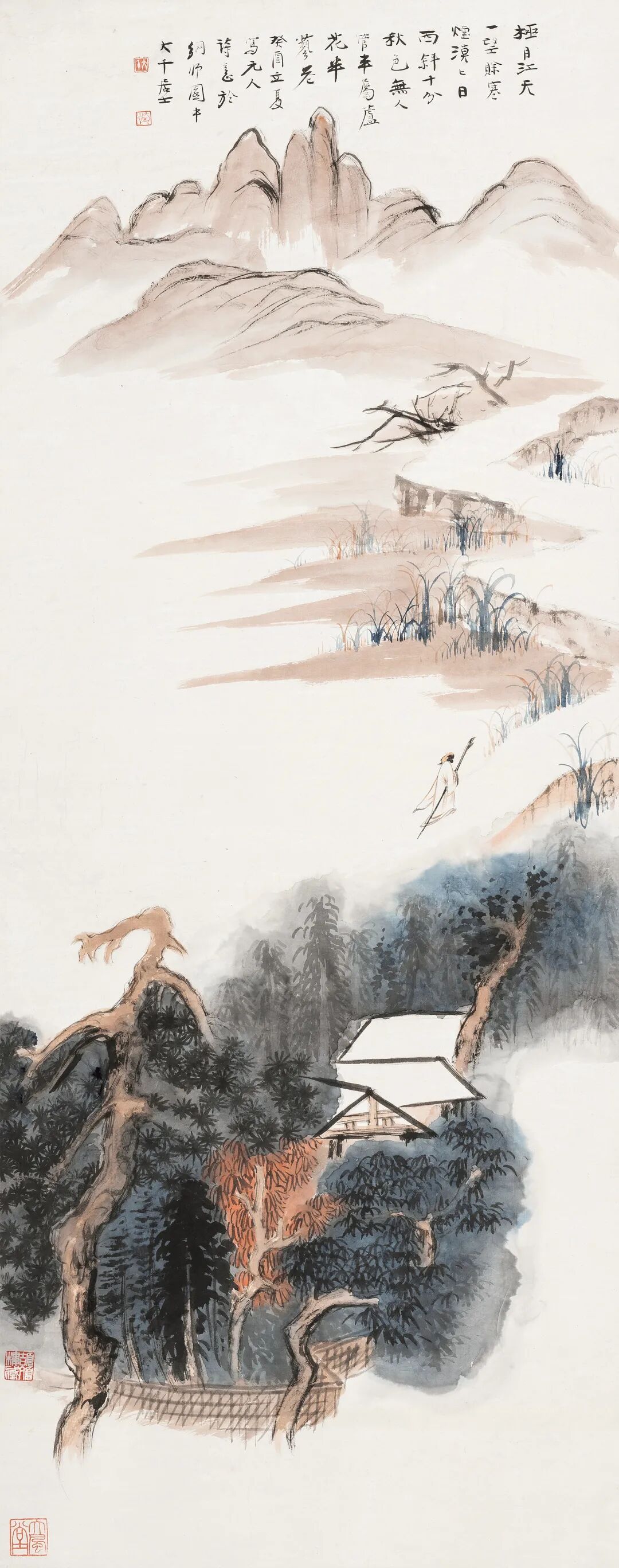 其用笔细致,树石勾勒精准而不沦琐碎;设色苍润明净,令画面自生清丽秀逸之韵,正是大千丰沛创造力的呈现——寓目于山河而采之笔端的传神隽逸,实属其早期以元人诗意写胜景之佳作。