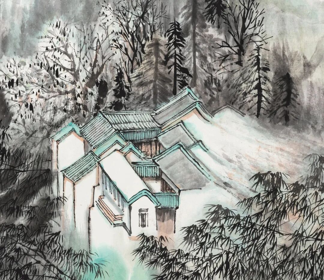 何海霞擅于将现实的场景转换成自己的山水画笔墨语境,使中国画具有现代性审美意义。《香雪海》用笔繁复但笔笔到位,既得开阔高远的山水“意境”,又能恰到好处地“化境”为时代风貌,实为何海霞的经心之作。