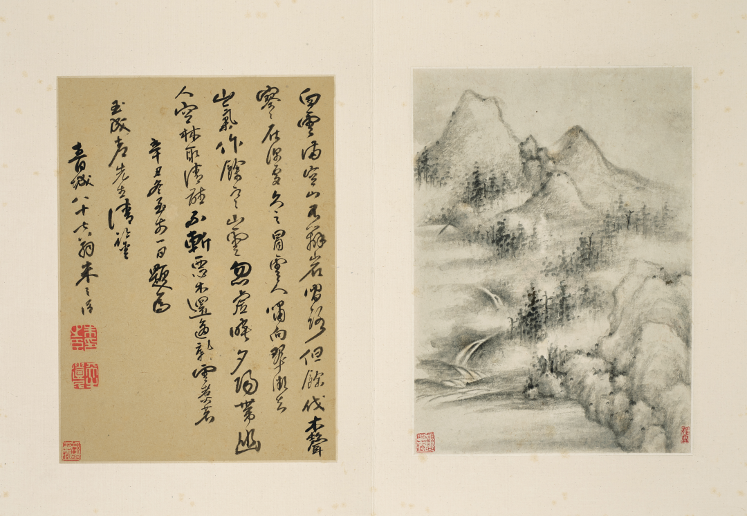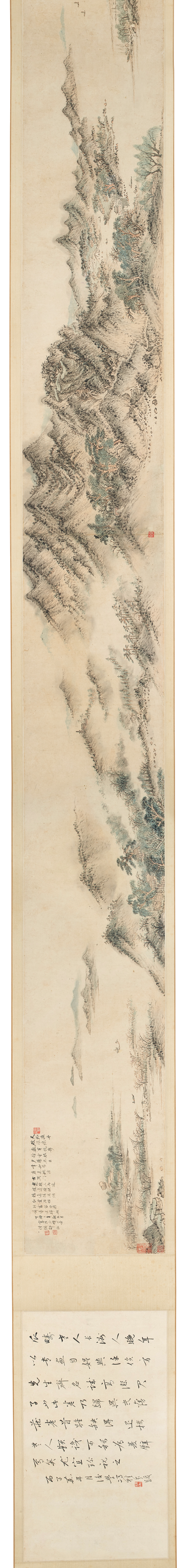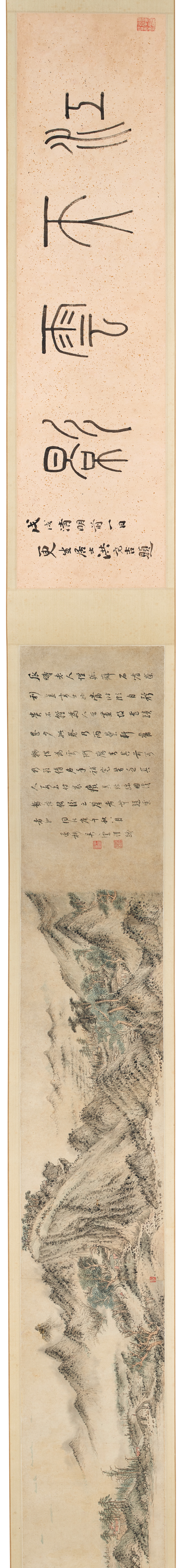 注:邵弥绘山水手卷希见于世,清代学者翁方纲称其「生动超逸,所不待言,而即前人往复嗟赏,流连兴感之意,亦岂应仅作笔墨观乎?」本幅可窥得一二。展卷细品,用枯笔淡墨,造率真洒脱、烟云缭绕之感,图中山峦层迭,清气升腾,似有恬淡出世韵味,为晚明文人画之典范。本幅曾入吴平斋「两罍轩」珍藏,惜其得此卷时已有破损,故于前书一段以示明;后冯桂芬跋尾,将吴平斋书法与邵僧弥山水合称双璧,或可谓塞翁失马。