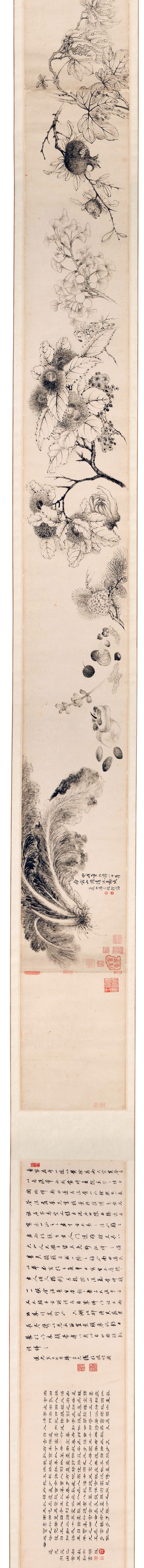 注:本幅为潘是稷所绘,其人年少因慕恽寿平而改字南田,经张若霭荐入为宫廷画家。后自研干擦法门,在花卉虫草画法中独辟新路,于千年古韵中另创一脉,难能可贵,为时人所宝。本幅附韩荣光、罗天池跋(黄其勤代书),曾入质亲王永瑢府,经孙祖同「虚静斋」鉴藏,流传有序。