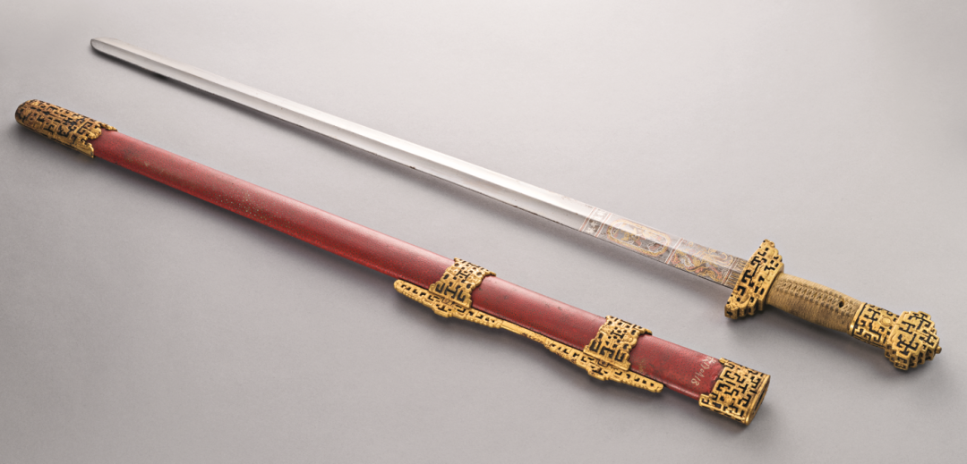此为乾隆皇帝御用“德兴”剑。剑柄木质,护手和柄头为铁鋄金镂空花卉纹。剑身钢质,一面隶书“天字七号”和“德兴”剑铭;另一面隶书“乾隆年制”款及一人用剑一人拱手图案。此剑重24两,被命名为“德兴”,是清代以武立国、以德治国的体现。