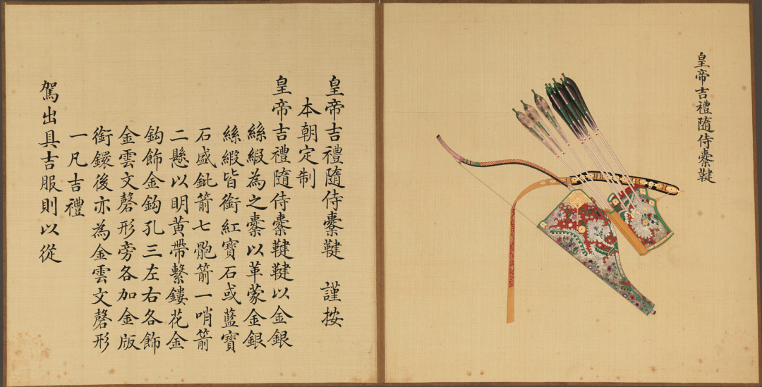 其上绘有櫜鞬。据《左传》记载:“櫜鞬,盛放弓失之器。”櫜以受箭,鞬以受弓。清代皇帝的御用櫜鞬按等级可分为吉礼随侍櫜鞬、大阅櫜鞬、行围櫜鞬、随侍櫜鞬等。如吉礼祭祀时,皇帝需身着吉服,佩带吉礼随侍櫜鞬。