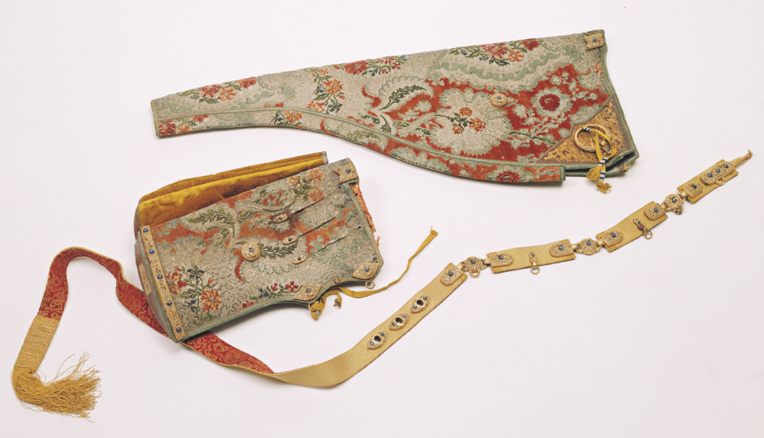 这件吉礼所用櫜鞬以皮胎制成,用绒及金银丝缎组成花叶图案,绿皮边,面镶铁鋄金镂虁龙饰件,上嵌蓝宝石;櫜背壶三,面为黄绒,绦带一根。