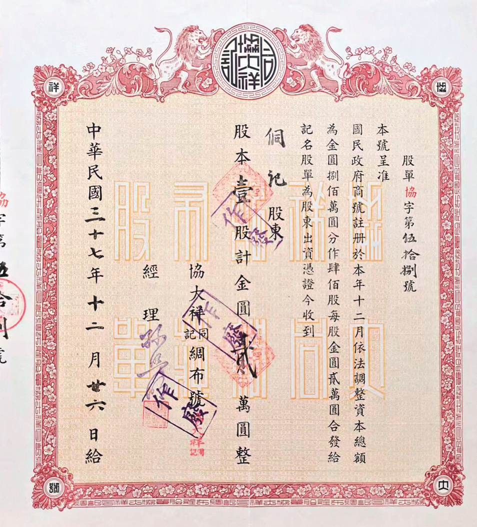 “协大祥”创办数十年间曾多次增资。自1923年股东分家至1948年,“协大祥同记”的名称一直沿用。由于每次增资时,旧股票都被销毁,所以留存下来的“协大祥”股票很少,尤其是早期发行的股票非常罕见。这张股票上可见一对狮子拱着带有“协大祥同记”字眼的圆球,极富喜气。![]()