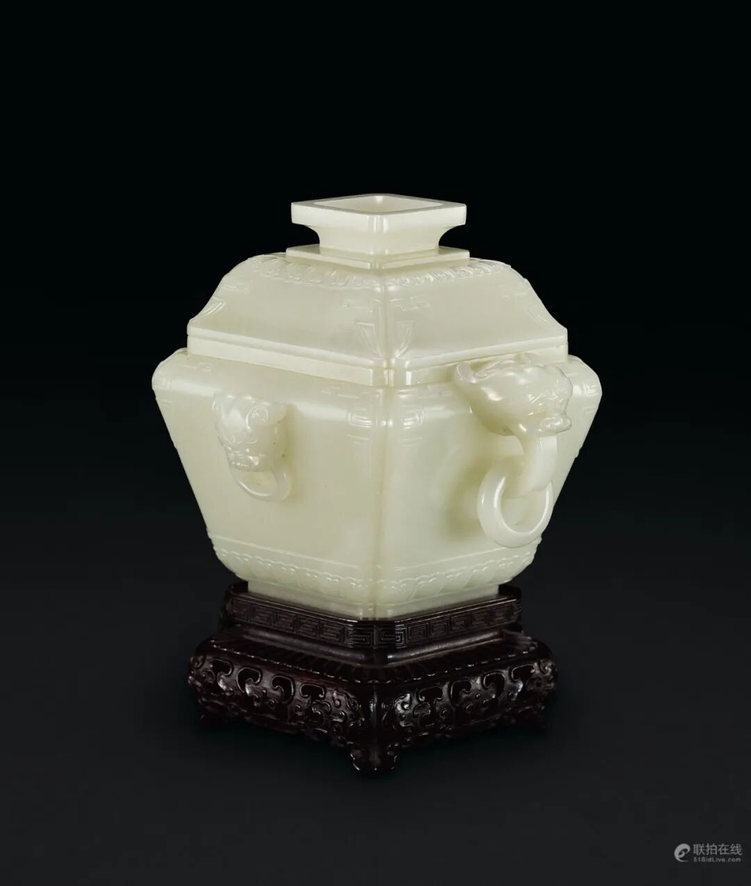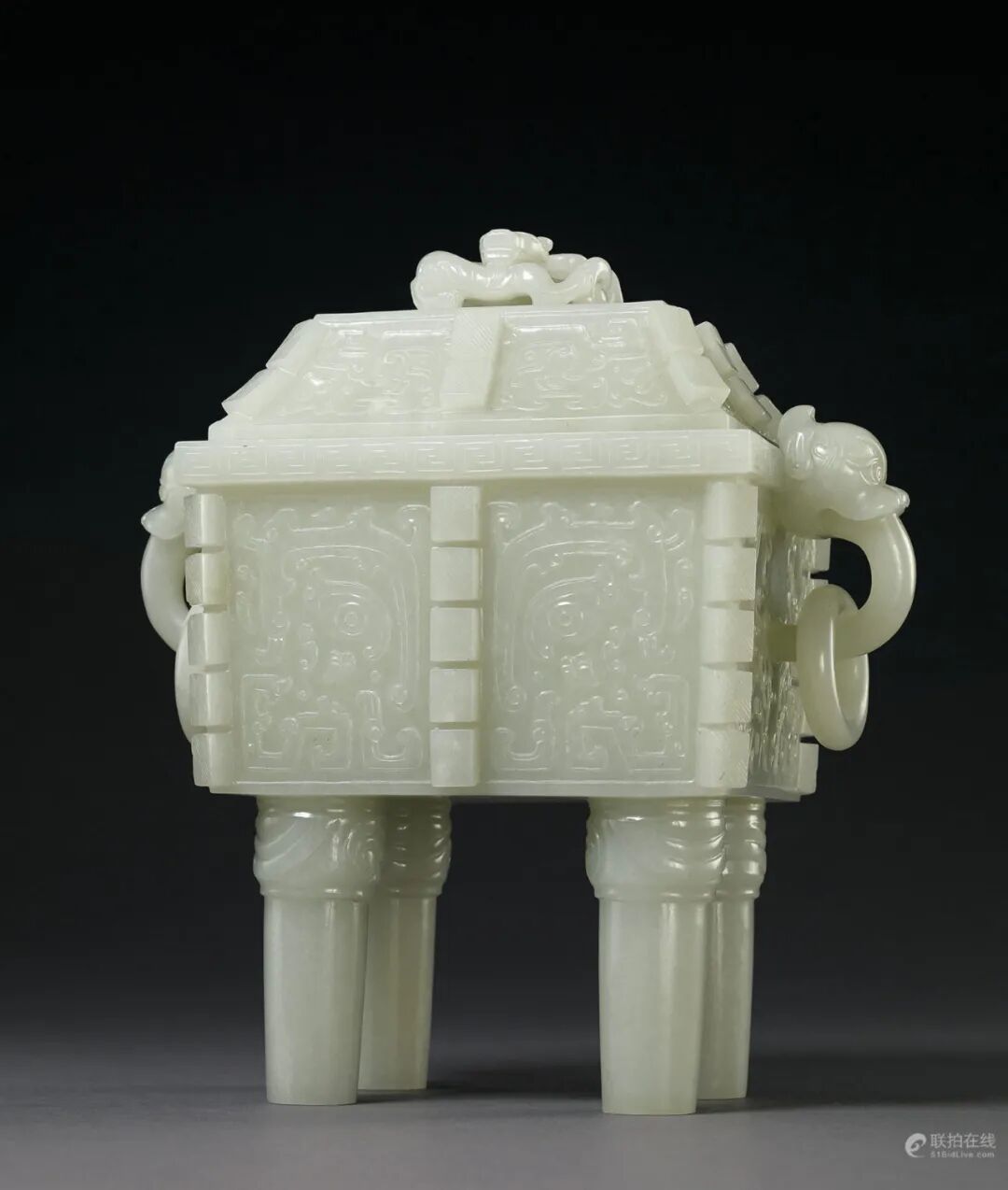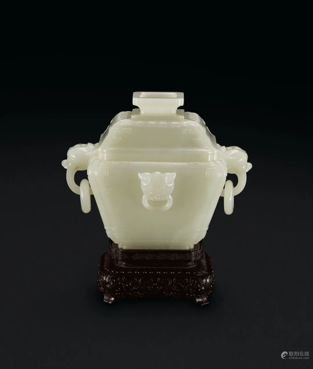 拍品估价:2,200,000 - 2,800,000 新台币炉取整料白玉为材,玉质细腻,洁白无瑕。配斜方形盖,盖顶设方形束腰抓钮,钮下刻莲瓣纹一周,盖面光素,盖及炉腹四棱线处饰仿古兽面纹,眉线凹凸曲折,双层三角形眼,纹饰古朴抽象。炉口呈倭角方形,丰肩,腹部向下收敛,承接方形倭角圈足,炉身左右凸雕兽首衔双环耳,兽圆眼浓眉,鼻翼宽厚,吐长舌连接炉腹恰成半圆形环,再接一活环。炉身前后面各高浮雕一兽面衔环,腹部光素,近足处一周凸棱,下承莲瓣纹。整体除局部雕琢仿古纹饰加强装饰效果,增加端庄肃穆感外,其余部分遵循良玉不雕的原则,纯以玉材本身剔透美感取胜。