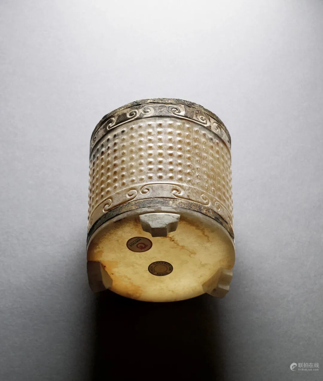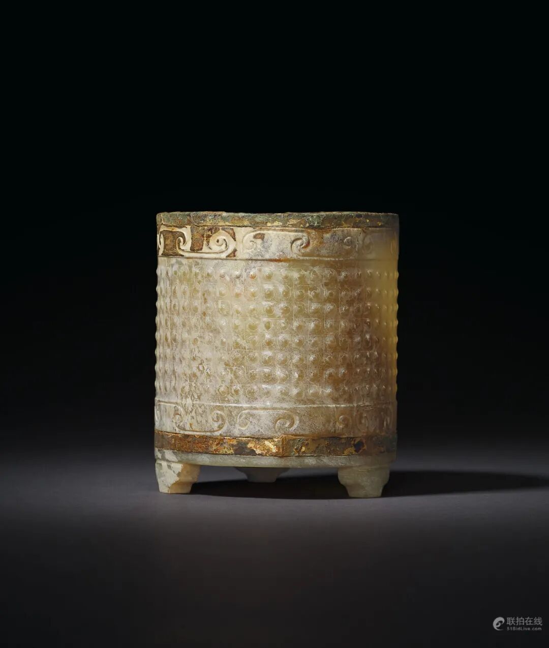 拍品估价:500,000 - 800,000 新台币2.梅英明先生私人收藏,1990 年代购自奉文堂;黄玉质,浅黄色泽,质地细润,上端受沁呈鸡骨白色,余带有深浅不一褐色沁。卮体呈圆筒形,直口,平底,下承三蹄足。口沿及近足处各嵌青铜一周,青铜鎏金和卮壁平齐,鎏金表面红、绿铜锈渐层分布自然,带有端庄瑰丽之质,工艺之巧令人赞叹。卮腹壁上下各隐起一道宽带纹,其上琢刻连续勾连云纹,两两相互对称,线条婉转流畅。上宽带局部沾黏铜锈,宽带纹之间满饰排列整齐的乳丁,浑圆凸起,饱满匀称,并作阴线勾连排列成勾连云纹,规整精致,别具巧思。