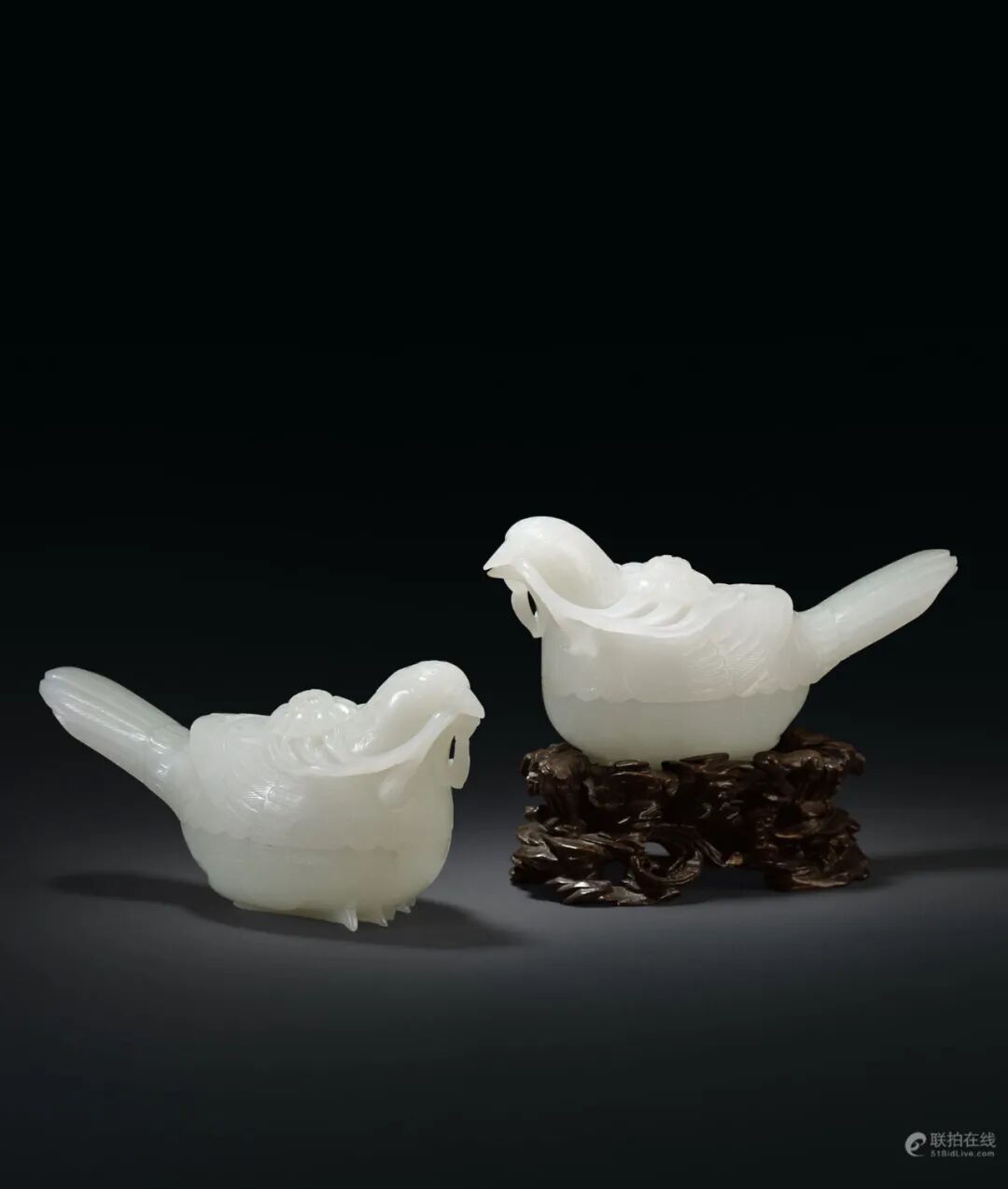 拍品估价:2,800,000 - 3,000,000 新台币1.香港苏富比,1988年5月17-18日,编号 550;3.香港佳士得,1999年11月2日,编号 832;盖盒一对取精良白玉为材,凝润如脂,莹洁细腻。以喜鹊为原型雕制而成,呈坐卧姿,内挖膛成容器,分上下两层,随翅形成的弧线式子母口相合,可开启。喜鹊尖喙,口衔纤柔菊枝,圆首短颈,身形饱满圆润,颈羽错落有致,翎羽根根分明,毳动氄张,尾羽上扬,灵巧鲜活姿态尽显,使人见之顿生喜爱。细观本品,精致典雅,琢制精细,线条婉转流畅,结合挖膛、阴刻等多种工艺制作,展现工匠一丝不苟之精神,视觉效果雍容华贵,实为清宫皇室贵族缔结良缘时不可多得之巧作,更凸显皇家礼仪和尊贵。