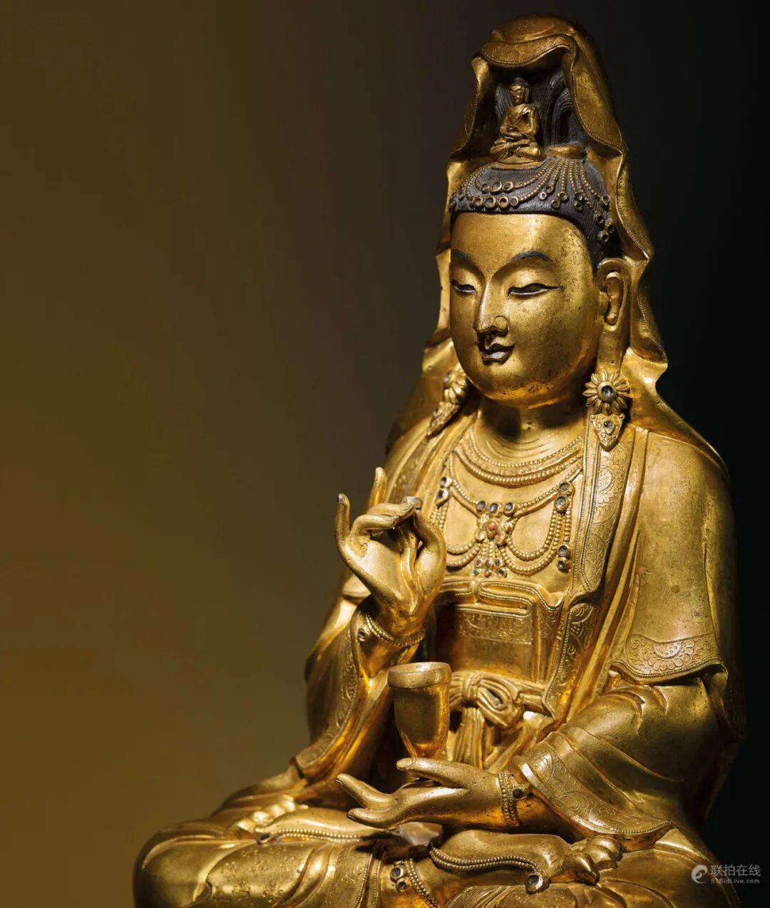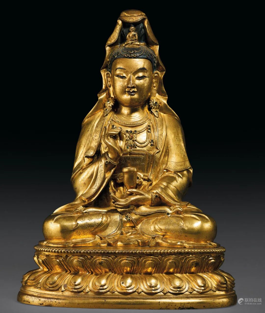 拍品估价:8,000,000 - 10,000,000 新台币展览:「金铜佛造像特展」,鸿禧美术馆,台北, 1993 年出版:《金铜佛造像图录》,鸿禧美术馆,1993 年,页 100-101,图版 431.Madame de Saint Victor 收藏;2.香港佳士得1992年3月31日-4月1日,编号976;4.纽约苏富比,2019年9月10日,编号314;尊像精铜铸成,鎏金朗润灿烂。头罩风帽,发向上梳起高髻,间束金镮,垂饰流苏式璎珞,正面中央安阿弥陀佛形象之化佛,是观音像的经典标识。观音高额宽广,面容丰腴,眉眼细长,双目下视,鼻梁尖挺,红唇轻抿,嘴角微扬,充分展现出典雅文静、静美柔曼之态。大耳垂肩,戴轮花珥珰,颈佩华丽璎珞,手足配戴连珠钏环。身着汉式双领垂肩袈裟,内层法服,腰系结带,衣褶转折自若,贴身流畅,腿部装饰略呈椭圆形褶襬,彰显线条流动柔和。结全跏趺端坐于束腰仰覆莲台上。以錾刻技法于风帽、长裙装饰花瓣纹,衣缘饰缠枝莲纹,并以细小连珠为边,打磨精细,珠粒圆润,极为精美,反映出宫廷造像高超水平。左手于脐前托净杯,右手拇指与中指相合,持一杨柳枝(叶已佚),似将杨枝蘸水向外挥洒,表示以大慈悲遍洒甘露水,为众生消灾避难,无垢至净。本尊观音像来源颇为显赫,曾为国际著名的法国社会名流Madame de Saint Victor 收藏,1992 年现身香港佳士得,为鸿禧美术馆珍藏。2019 年,纽约苏富比特别以「光明无量.应身度世」呈献鸿禧美术馆旧藏铜鎏金佛造像专拍,本件十七世纪 铜鎏金观音坐像,在当时便受到多方藏家关注,最后由芝加哥亚洲传统艺术博物馆拔得头筹,以丰富精致博物馆的收藏。
