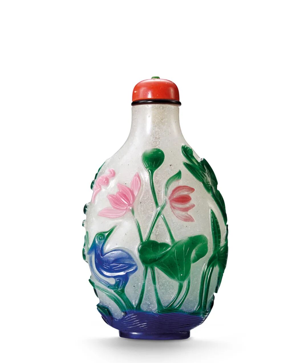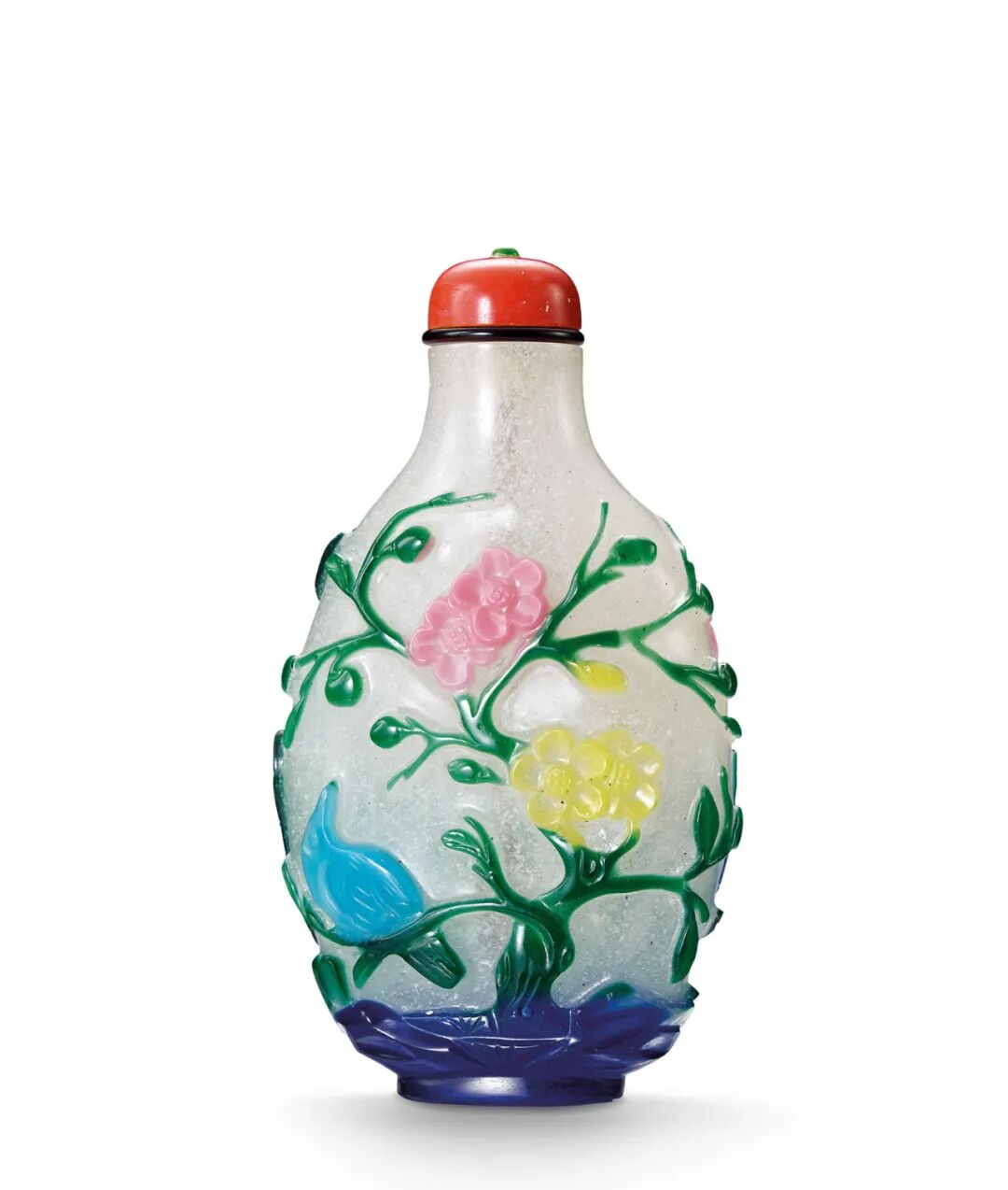 拍品估价:400,000 - 480,000 新台币展览:「壶里乾坤:鼻烟壶珍品展」,国立历史博物馆,台北,2008年8月29日-10月26日出版:《壶里乾坤:鼻烟壶珍品展》,国立历史博物馆,台北,2008年,页23壶直口,溜肩,椭圆形扁腹,椭圆形圈足。以含有霜花般细密气泡的白玻璃为地,套有绿色、蓝色、粉色、黄色等五彩装饰,因瓶身透明带有如天空雪花纷飞之小汽泡,故称之为霏雪地。一面莲花挺立,莲叶翻转生动,间有莲蓬挺拔,鹭鸶栖息于水草旁,空中蝙蝠飞舞,有连升一路发之意。另一面为喜鹊伫立于弯延的梅树,回眸顾望,花朵盛开缤纷,有喜上眉梢之意。整体布局精巧,玲珑华妙,精美如珍。