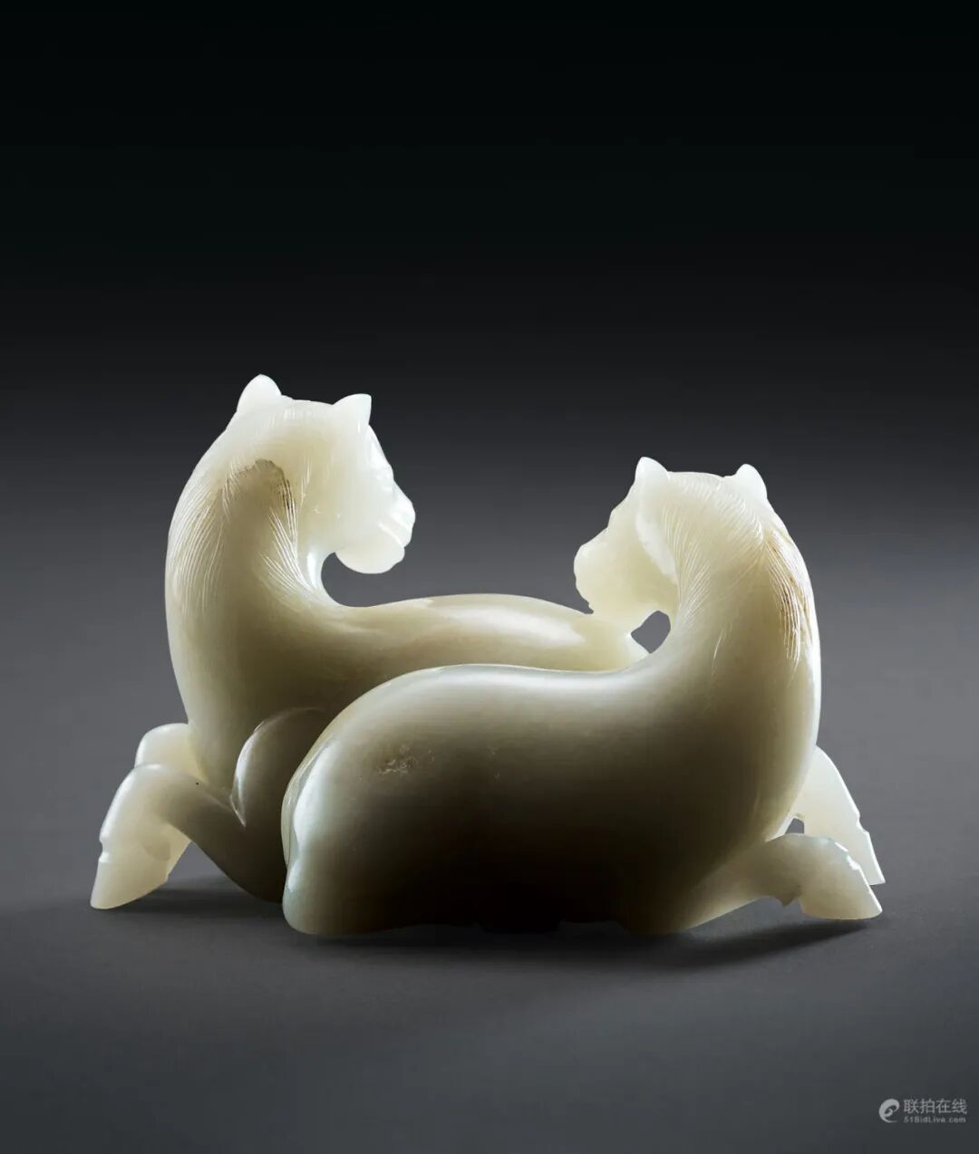 拍品估价:1,500,000 - 1,800,000 新台币1.纽约佳士得,1991年11月27日,编号155;3.巴西圣保罗 Gerard Arnhold 收藏;4.纽约佳士得,2018年9月13日,编号 959;青白玉质,细润纯净,厚实坚密,局部留皮及金黄色沁。全器立体雕琢双马相倚而卧,回首相视。瑞马菱形双目,双耳竖立,嘴微张,马颈背鬃毛刻划自然流畅,长鬃自头顶垂至两侧,贴颈后下垂。鬃毛与长尾皆以细密绵长线条平行排布而成,宛如细丝真发。身躯壮硕,弓身俯卧,肌肉强健有力,比例协调。前肢微抬,后肢趴卧于腹下,尾沿后腰内卷。一只下颚微仰,轻抚另只臀部,状极亲昵。全器表面打磨细致,呈现凝脂光泽,所施线条沟渠粗深,刀法简洁利落,予人劲道十足之感,金黄色沁犹如和煦阳光洒落,引出草原动物休憩可爱的体态与神韵,令人回味无穷。