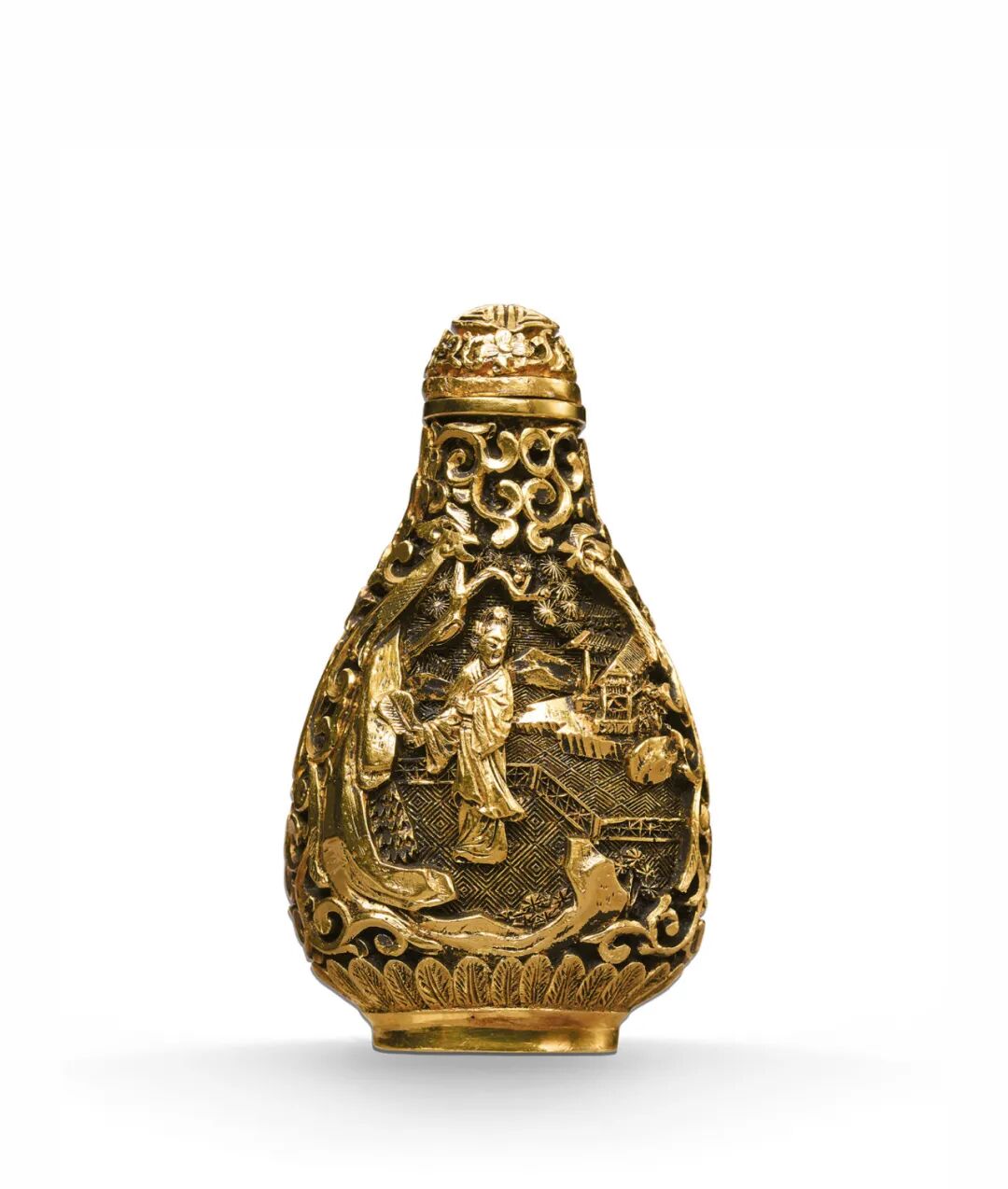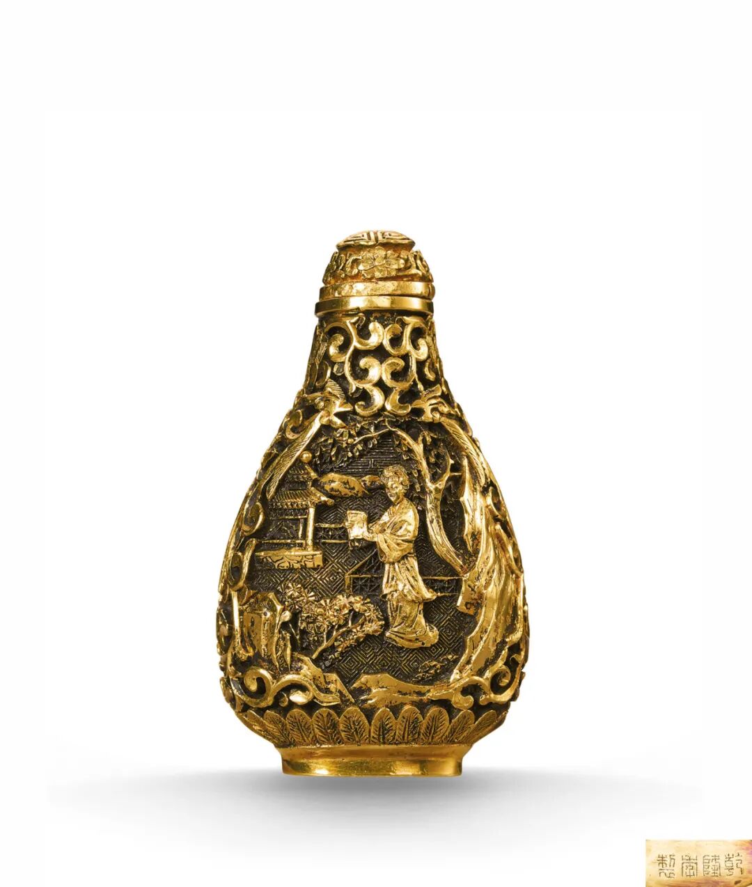 拍品估价:1,500,000 - 1,700,000 新台币展览:「壶里乾坤:鼻烟壶珍品展」,国立历史博物馆,台北,2008年8月29日-10月26日出版:《壶里乾坤:鼻烟壶珍品展》,国立历史博物馆,台北,2008 年,页162、170-171壶直口,溜肩,扁垂腹,椭圆形圈足。壶身、壶盖皆取黄金雕制,金光璀璨,光泽熠熠。盖顶雕琢寿字纹,下承花卉纹一周。壶身剔地高浮雕缠枝纹,线条婉转稠密,近底处雕叶片纹,叶片排列整齐,叶脉纹理清晰。壶身两面开光,开光边缘各有一对凤鸟环绕,凤鸟对望,造形简约略为抽象,凤羽修长,沿着开光延伸,又恰似山岩峭壁。开光内雕细密锦地,其上仕女亭亭静立,或手持书册,或手执羽扇,身姿柔美婉约,姿态娇美。四周老树参天,生机勃勃,亭台若隐若现,雕梁画栋,极为精美。底刻「乾隆年制」单行四字篆书款。