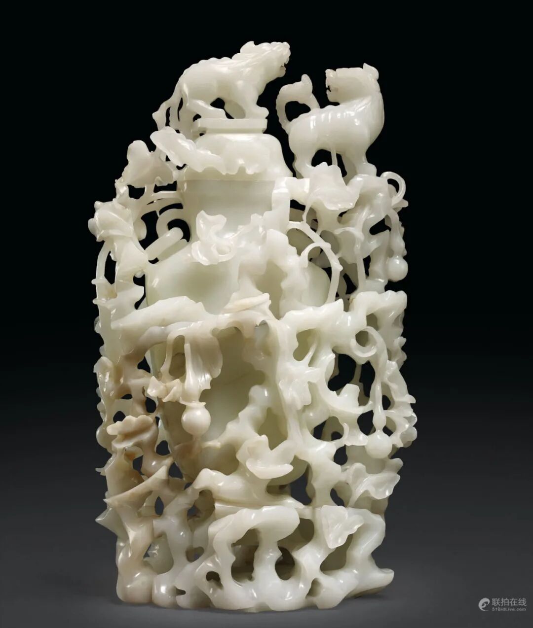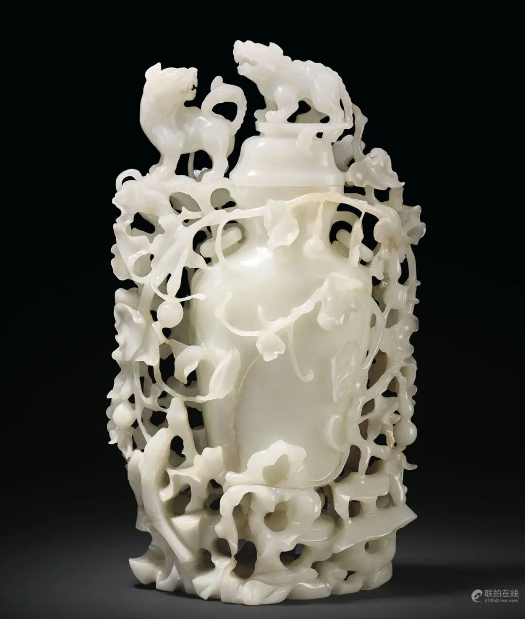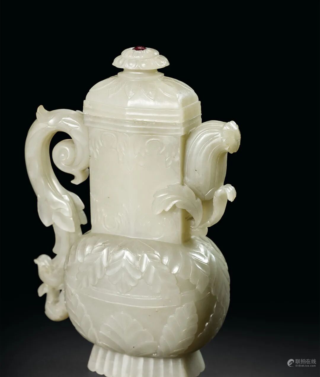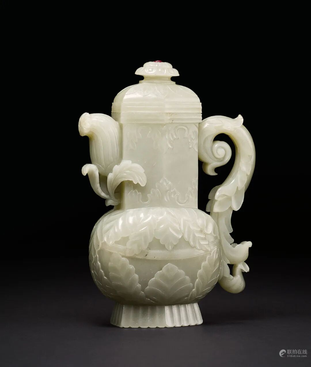 拍品估价:2,000,000 - 2,200,000 新台币展览:「圆明园—大清皇帝最美的梦」,国父纪念馆,台北,2013年7月5日-9月29日1.《谁在拍卖中国》,漫游者文化,2010 年,页239;2.《圆明园—大清皇帝最美的梦》,顽石创意,2013 年,页 278-279,图版 V-342.美国 Skinner Inc,2009年10月18日,编号 579青白玉质,细腻光泽,包浆油润。壶分盖与身,盖呈六棱覆斗貌,面隆起雕叶片纹一周,上设仰覆双层莲花形钮,花蕊嵌红宝石,精致繁复中凝结出华丽、和谐与秩序之美。壶颈修长,沿续口沿形状呈六面形,正面棱线笔直,六边宽细不等,上下各装饰莨苕叶纹。流为花苞状,下托高浮雕、镂雕莲叶,翻转卷曲,线条优美。壶腹呈椭圆形,中央宽带纹一周,上下分别浮雕覆、仰莨苕叶一周,叶面纵横重迭,姿态生动。卷草式把手,上端卷曲贴于颈部,呈S形扭曲,其上高浮雕层层莨苕叶,灵巧鲜活。圈足与颈部呼应,呈六面体,并刻饰细长莲瓣纹一周。执壶通体雕饰精细,曲线婉转,繁复多姿的莨苕叶纹充盈浓郁西洋风韵,并流露巴洛克式华丽之特色。
