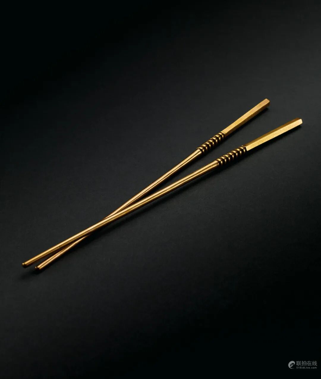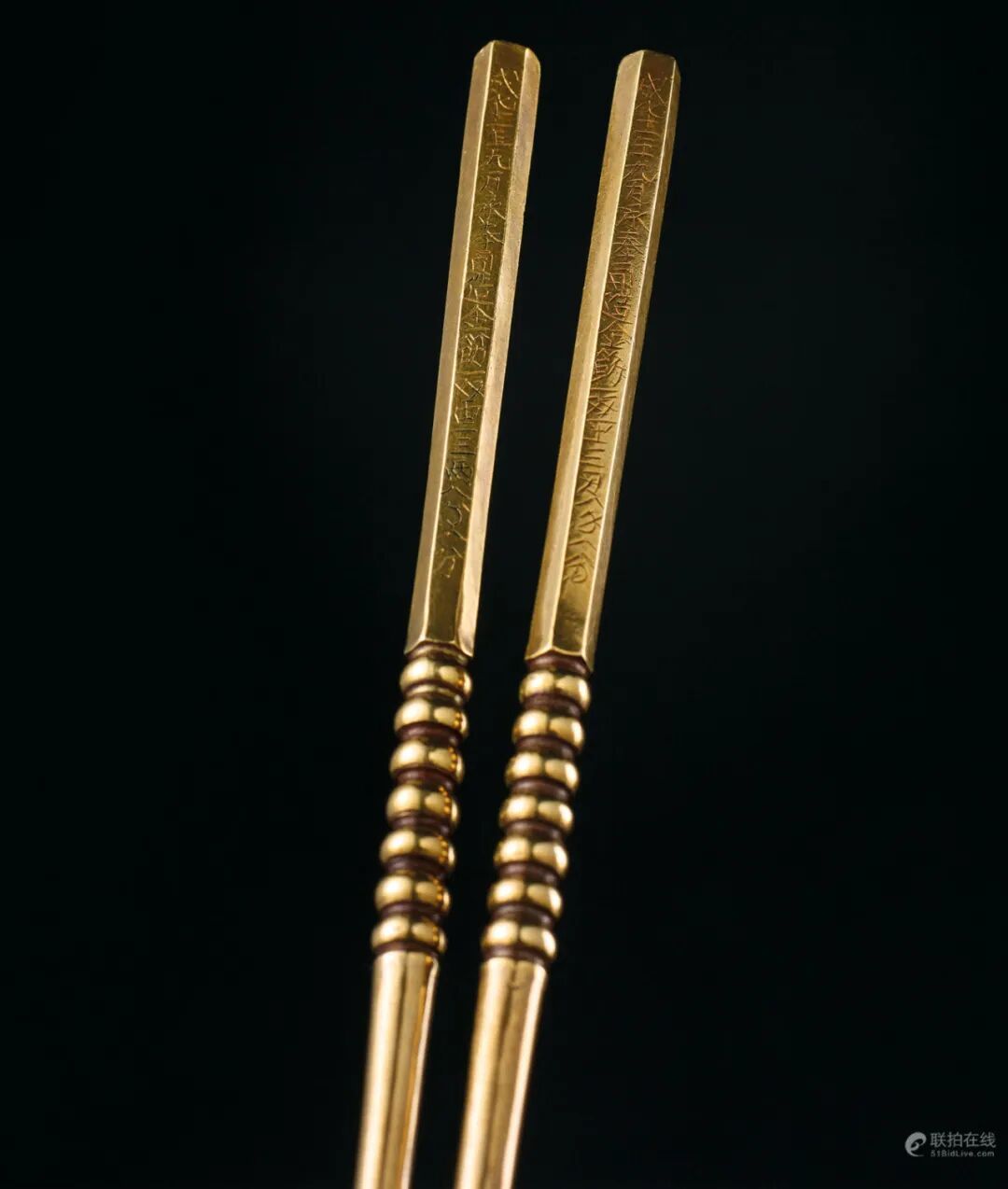 金箸为八成纯金打造,重144公克。首方足圆,首作六棱长方形,一面正楷阴刻「成化十一年九月承奉司造金箸一双重三两八钱八分」二十二字铭。箸足圆柱状且向下逐渐收细至末端呈锥形,箸首与足之间则饰有七层圆珠装饰,象征吉祥圆满,全器金光练达,宝光莹莹,华丽感倍增。版权声明:本文所涉部分图文、视频资料来源于台北宇珍国际艺术有限公司,版权归原作者所有,由联拍在线编辑整理。如涉及版权问题,请联系我们:400 608 1178。