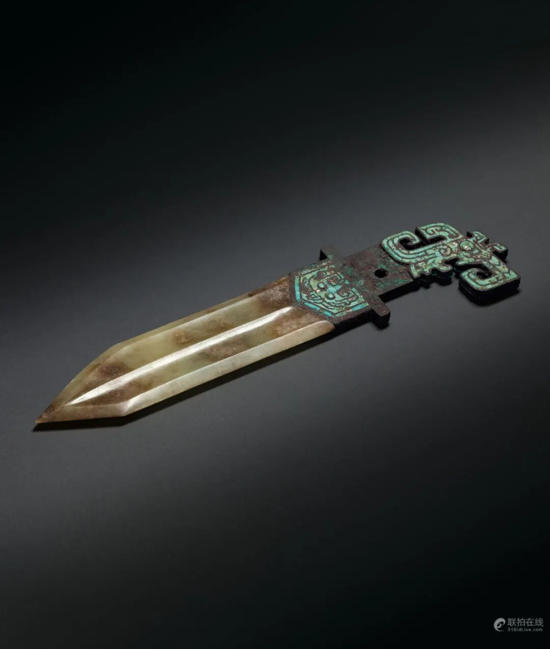 拍品估价:800,000 - 1,000,000 新台币玉质呈灰黄色,表面光亮润泽。器体扁薄,两侧有刃,刃部与边部有一凸起小隔线。中部有一道隐起脊线,脊线两侧微凹。阔援微曲,前锋呈三角形,峻峭尖锐,末端V 形与铜柄前端相合,上端有阑,近阑处居中有圆孔。铜柄内镶满绿松石,前端饰兽面纹,后端作歧冠鸟形,略弯曲,有「曲内奇冠」之称。