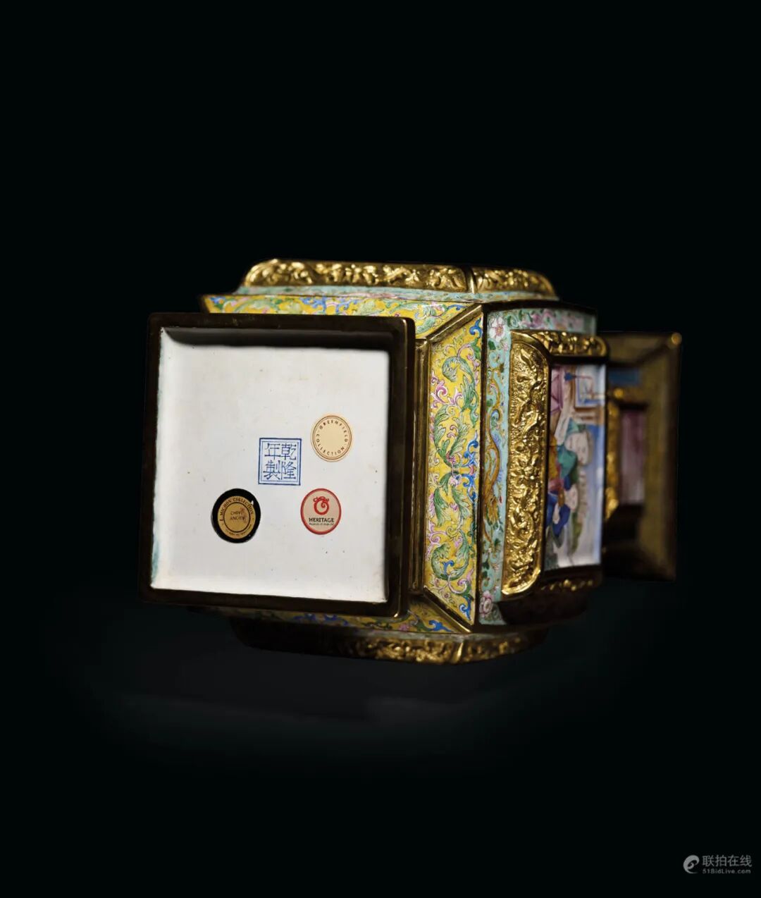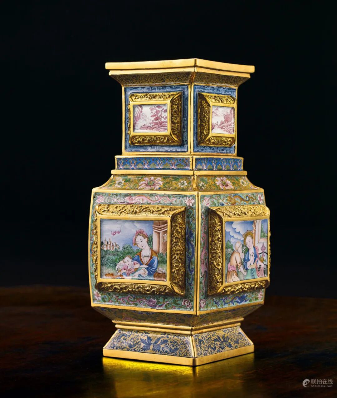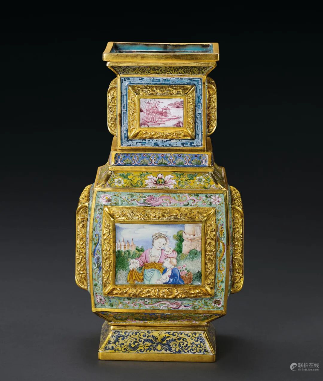 博物馆创办人梅英明(Jeffrey Moy)出自芝加哥华人望族,在古董艺术领域耕耘多年。早年为大收藏家艾弗里.布伦戴奇(AveryBrundage,1887-1975)特别助理,后接手 Paragon 书局与大英博物馆、故宫等全球多处著名博物馆的合作,并与收藏家安思远、Giuseppe Eskenazi、J.J.Lally、王世襄、奉文堂陈淑贞、云中居主人张伟华等保持深厚友谊。在丰厚的艺术资历中累积傲人佳藏,奠定成立博物馆之基础。拍品估价:800,000 - 1,200,000 新台币1.巴黎 L. Michon Charles A. Greenfield 伉俪私人收藏;方瓶铜胎,瓶身呈斗方形,平口折沿,多阶式长直颈,斜肩,方腹,撇方足,平底内凹。器以模铸,内施湖蓝釉,四面以镀金为界,口、足饰一周黄地画蓝釉卷草纹,肩及近底处饰黄地画洛可可式勾连缠绕的卷曲叶纹。颈、腹皆为镀金錾凸四棱式方形开光,内珐琅釉绘饰,形成三层立体画面。腹部开光处绘不同西洋母子图,采用西方写实绘画技巧,母子皆金发碧眼,妇女头发卷曲,各配丝带式头饰,深目高鼻,面容温和,身着华丽洋装,呈现享乐及愉悦表情。童子或背装满鲜花蓝子、或依偎母亲怀中、或手持如意、或手捧一孔方璧,轻松和谐表达母子间的爱意,更增添孺慕温情。底白地书蓝彩「乾隆年制」双方框双行宋体字款。细观本件方瓶,线条优美流畅,既具备金属贵重、坚固的特点,又具备珐琅釉料晶莹、光滑及适用于装饰的特点。颈部以胭脂釉绘红山水图,画面景致采用中国山水画远近、深浅、浓淡变化,笔触精细,立体感强烈,令人眼前为之一亮。