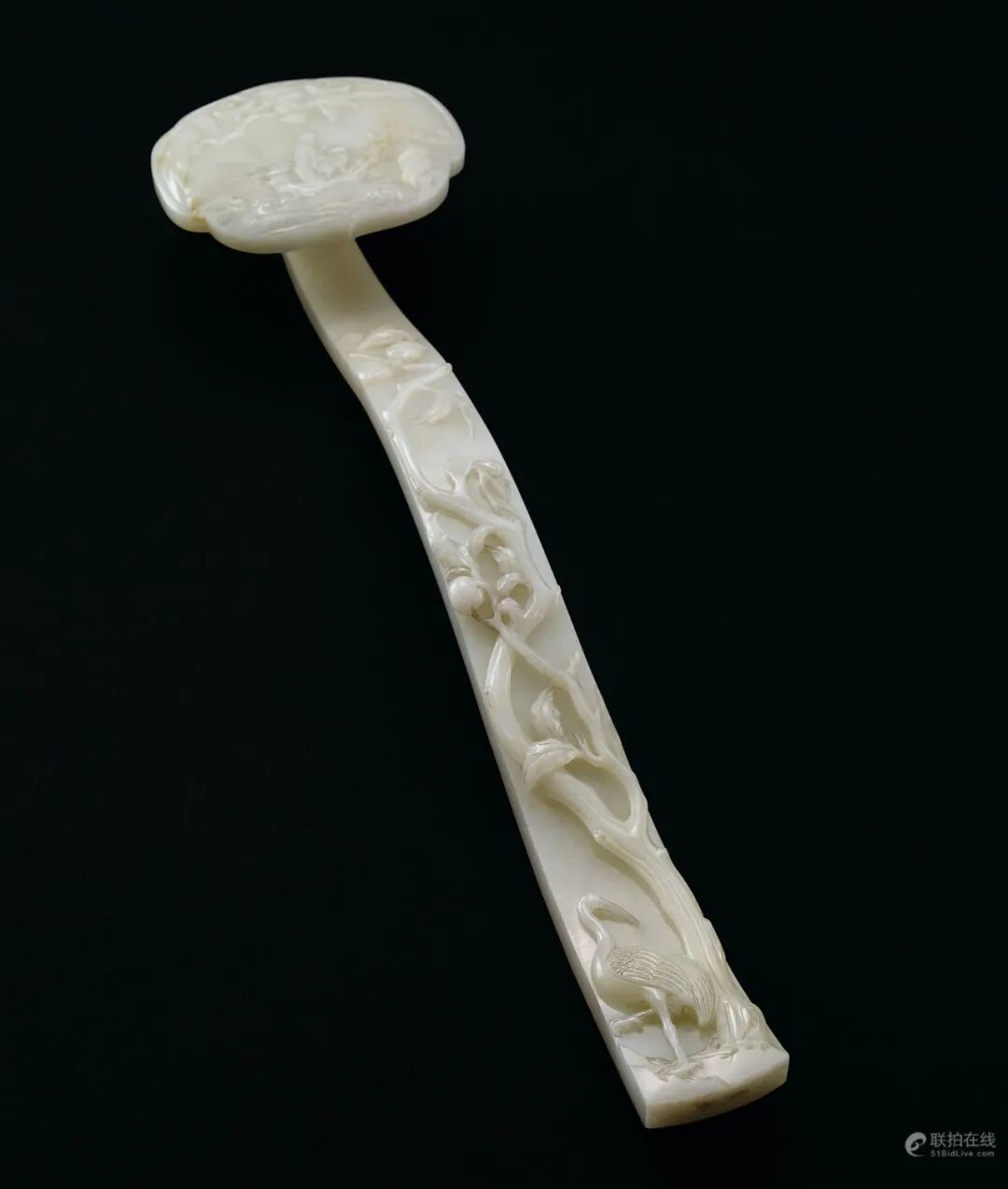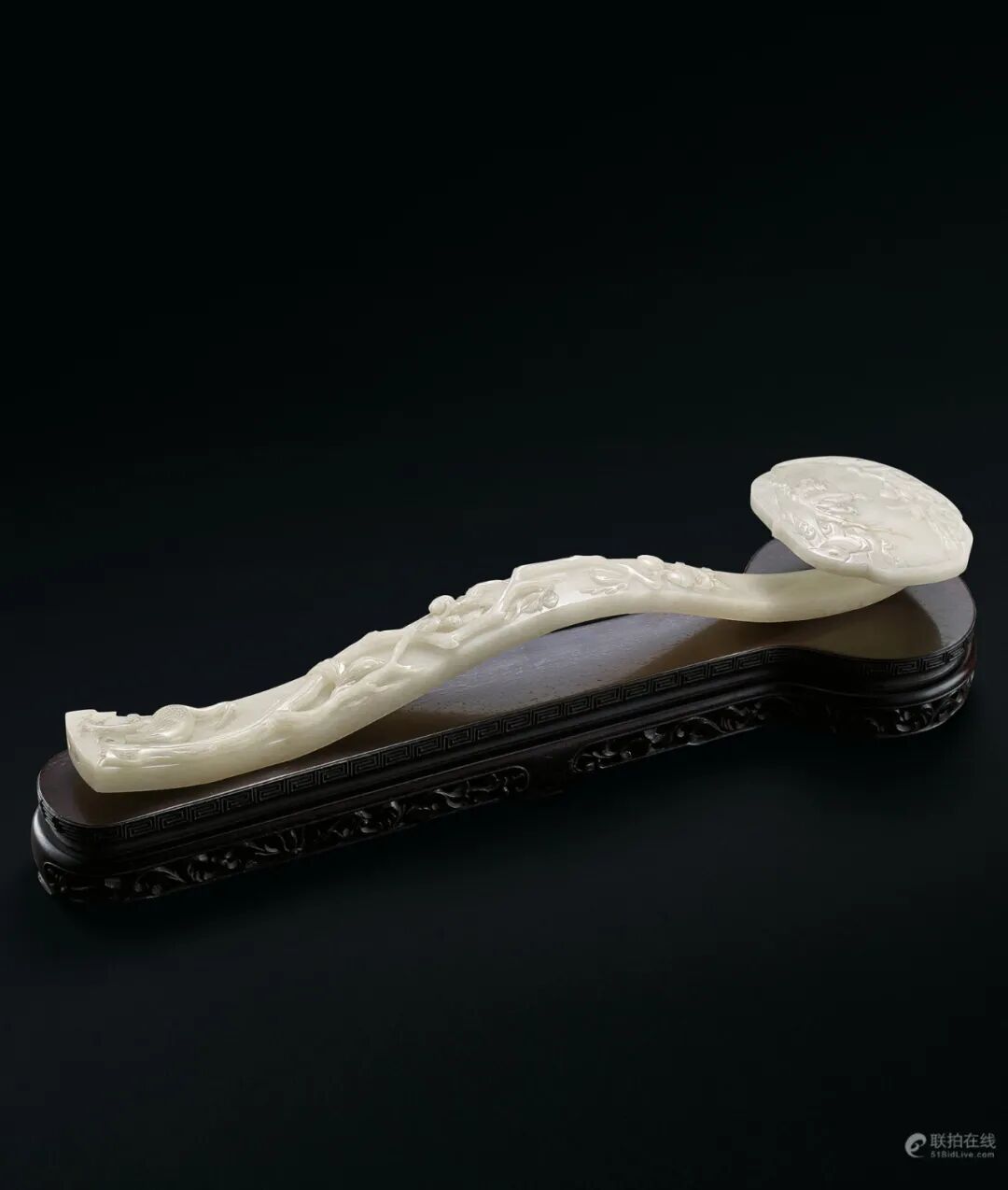 拍品估价:2,600,000 - 3,000,000 新台币如意以整料白玉雕琢而成,质地光润。作云叶式首,首面上半部起如意云纹边框,内压地浮雕祝寿图。画面中央仙女搭扶着灵鹿,共乘一截粗壮树干徜徉于海中,树干一端摆放仙女的提篮,篮中满是灵芝仙草,四周波涛汹涌,起伏激荡出阵阵浪花。岩壁间窜出桃树,枝桠横逸,翠叶鲜嫩,两颗硕大寿桃垂挂,整体画面充盈祥瑞氛围,表现出中国古代长寿仙女麻姑,正欲渡海为王母娘娘祝寿之景。柄身中部隆起,呈S形,由上而下渐宽,正面压地高浮雕参天桃树,枝干蜿蜒向上窜升,桃叶翻转自然,桃实圆润丰满垂挂枝头,细枝、嫩叶与桃实交迭掩映,立体感极强。