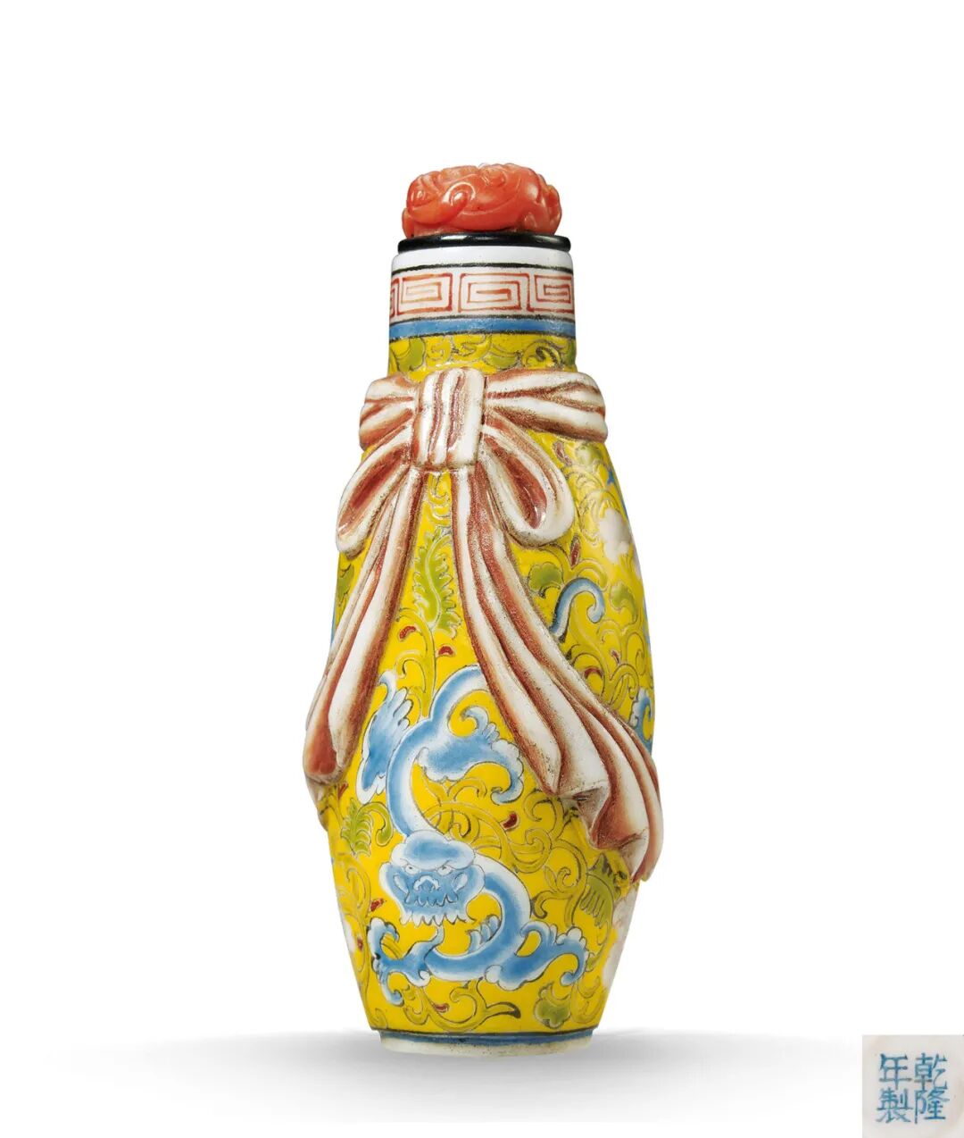 壶直口,溜肩,呈圆瓶形,浅圈足。通体以不透明乳白色玻璃为胎,口沿处可见温润柔白色泽,绘有红彩连回纹。壶体呈包袱状,在乳白色玻璃上烧一遍黄色珐琅,色泽饱满鲜艳。其上绘饰夔龙翻腾穿插于缠枝花卉间,卷叶蜿蜒,花朵盛开,局部嫩叶施以红彩妆点,色彩缤纷精巧。夔龙面目威严,身姿细长婉转如蛇身,四足变形仿若云形,造形生动富有装饰效果。本品最特殊之处,乃于颈部浮雕缎带系结,丝织物的褶皱起伏细腻精到,并于凹折处施以红色珐琅彩,显现明暗阴影,视觉上极为凸出抢眼,立体感十足,缎带垂坠效果更为此壶增添动感。底蓝彩书「乾隆年制」双行四字楷书款,字体纤细工整。