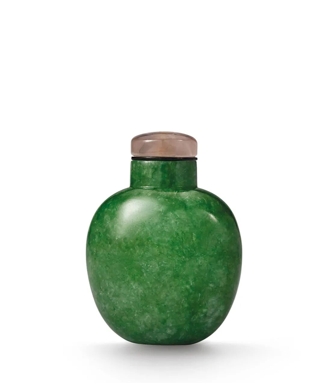 拍品估价:1,500,000 - 2,000,000 新台币展览:「壶里乾坤:鼻烟壶珍品展」,国立历史博物馆,台北,2008年8月29日-10月26日出版:《壶里乾坤:鼻烟壶珍品展》,国立历史博物馆,台北,2008年,页3、73天然翡翠为材,打磨细致柔滑,通体透亮,色泽娇翠,颜色鲜艳活泼且分布均匀,展现浑圆饱满之态。壶直口,丰肩,卵形圆体壶身,平底。线条流畅,造形简洁对称。全器光素无纹,更显翡翠材质之瑰丽美态。