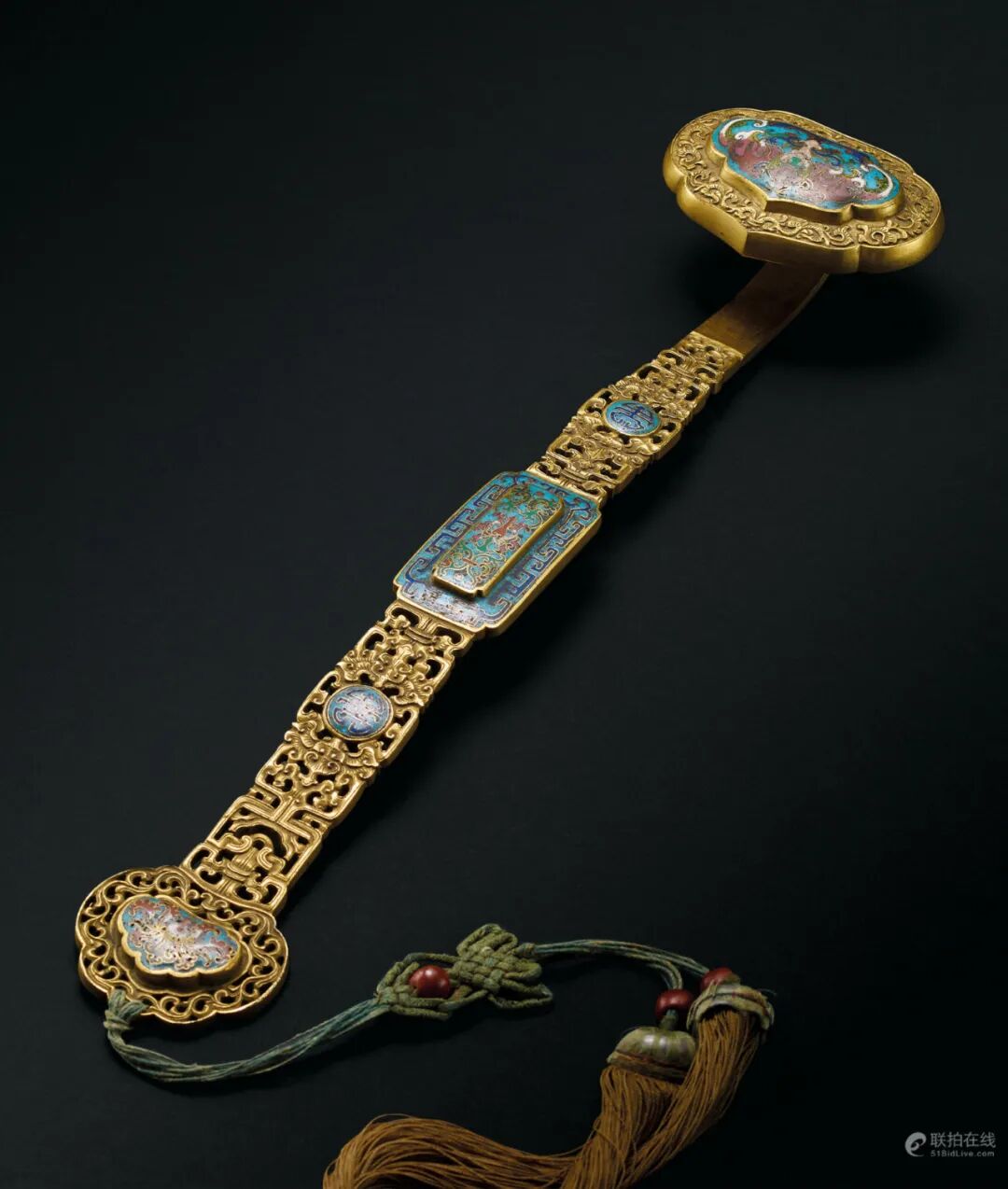 拍品估价:700,000 - 1,000,000 新台币来源:美国早期著名室内设计师 Francis Edward Searles (1841-1920)旧藏,家族传承如意三镶式,长柄弯曲,柄体呈S形,造形优美流畅。全器鎏金浑厚,雕琢细腻,金碧辉煌,尽显华贵富丽之感。柄身前后镂刻两组相向蝙蝠,共衔一圆形寿字,正面掐丝珐琅,背面鎏金,相间点缀,精致华丽。首、腹、趾部瓦托衔接,减地一层形成如意云肩式边框,首錾刻、趾镂雕饰卷草纹,腹掐丝珐琅变形夔龙纹,边框严丝合缝,浑然一体。三镶边框内饰掐丝珐琅,以蓝色珐琅釉地,间以红、黄、蓝、绿等色彩点染,饰蝙蝠及西洋莲纹装饰,纹样繁复细密,华美绚丽,以表达福寿绵延、万年福寿的祝贺之意。尾端则系有黄丝穗。本件如意特别之处在于柄体鎏金镂空及三镶掐丝珐琅的样式,为形制较少的特殊美例。