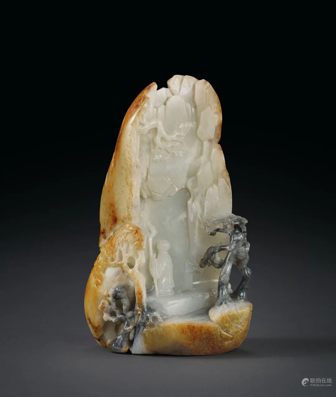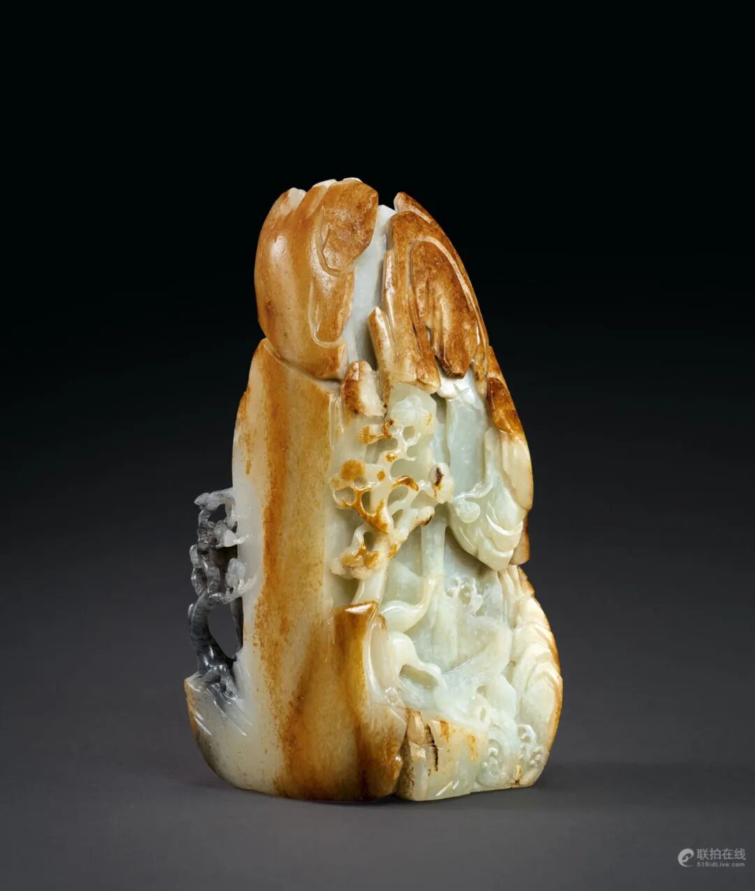 拍品估价:2,800,000 - 4,000,000 新台币2.香港苏富比,1987 年11月25日,编号403;3.Alan and Simone Hartman 伉俪私人收藏;4.香港佳士得,2006年11月28日,编号1370;6.纽约佳士得,2011年3月25日,编号1508;7.香港苏富比,2016年4月6日,编号3011;1.「Chinese Jade from Southern California Collections」,洛杉矶县立美术馆,洛杉矶,1976 年 10 月 26 日 - 1977 年 2 月 6 日,编号 34;2.纽约佳士得,2001 年 3 月 13 日 - 26 日3.「Chinese Jades from the Hartman Collection」,波士顿美术馆,波士顿,2003 年 8 月 23 日 - 2004 年 11 月 3 日4.「Arts of Pacific Asia Show」,纽约,2009 年 3 月 14 日 - 18 日5.「Grosvenor House Art and Antique Fair」,伦敦,2009 年 6 月 11 日 - 17 日1.《Chinese Jade from Southern California Collections》,洛杉矶县立美术馆,洛杉矶,1976 年,页 49,图版 34 〈A Collection of Chinese Carved Jade〉;2.《Lapidary Journal》,Interweave Press,1979 年 6 月,封面 ;3.《The Jade Kingdom》,Paul E. Desautels,纽约,1986 年,页 93 ;4.《Chinese Jades from the Collection of Alan and Simone Hartman》,Robert Kleiner,香港,1996 年,编号 131 ;5.《RECENT ACQUISITIONS》,S. Marchant & Son,伦敦,2009 年,页 112-113 及封底里,编号 61本品出自 S. Marchant & Son。山子精选上乘和阗白玉籽料雕就,质地致密细腻,温润亮泽。通景运用高浮雕、圆雕、镂雕等技法,以“借皮设色巧犹能”之特点表现,将中国山水画精髓融入其中,写实写意相结合,如同画家追求笔墨情趣般,彰显画作立体化的完美体现。画面中高山峻岭,朝阳灿如黄粟,闪耀夺人耳目,山间飞瀑激流,流泄而下,至底部形成漩涡,气势磅礡。嶙峋山岩间崖柏横逸,峭壁陡坡,高士仰眺,与身后古松劲岩相应,旷达清幽,颇具文人情怀,整体构图充分展现文人逸士「凌风知劲节,负雪见贞心」的高尚本质。延循至山子侧面山岩,松柏盘聚,山涧流水潺潺,产生微妙动势。再往后延伸,苍松挺拔矗立山间,松枝蜿蜒多姿,松针茂密如轮,松下双鹤伫立,或引颈翘首,或低首饮泉,姿态美妙,徜徉于灵秀山水之中,灵动传神,意境高雅,表现出宁静恬淡的艺术美感,应属乾隆时期「画意玉器」的上乘佳作。