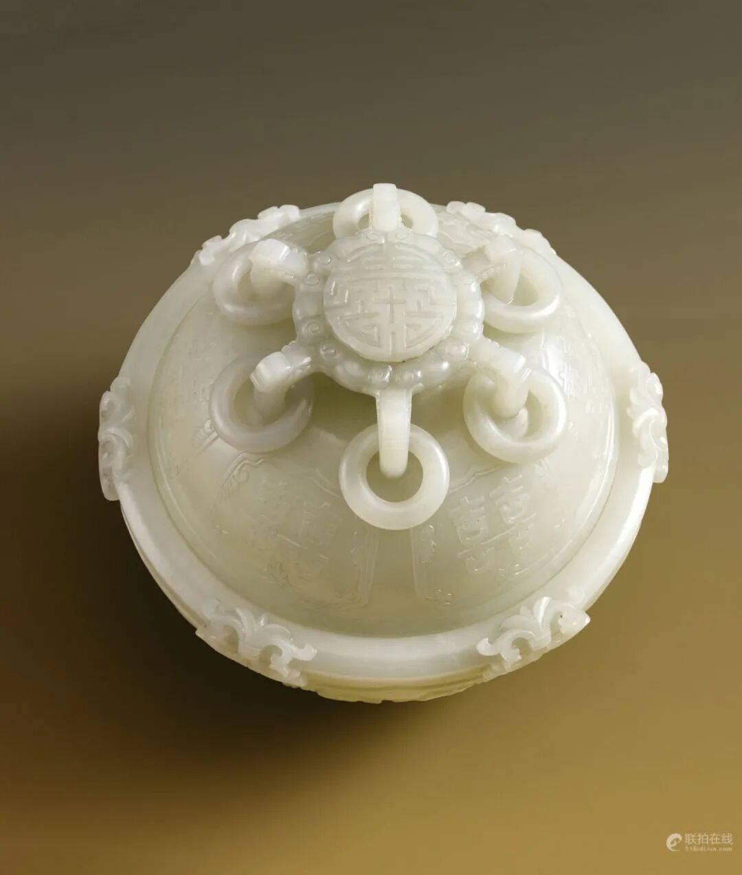 拍品估价:1,000,000 - 1,500,00 新台币白玉质,质地细腻清润,色泽皎洁透亮。器分盖与身,子母圆口紧密扣合,严丝合缝。盖顶饰莲蕊钮,面隆起饰双层覆莲瓣纹;器身鼓腹,腹壁光素,下承浅圈足。口缘凸雕等距莲瓣式折沿,瓣尖饰如意纹,纹样细致,雕工利落,线条挺拔规整。盖与身以仰覆莲瓣增强造形,如花瓣围绕花蕊一层层展开,颇具层次感与视觉艺术效果,展现乾隆朝玉雕的精湛技艺。