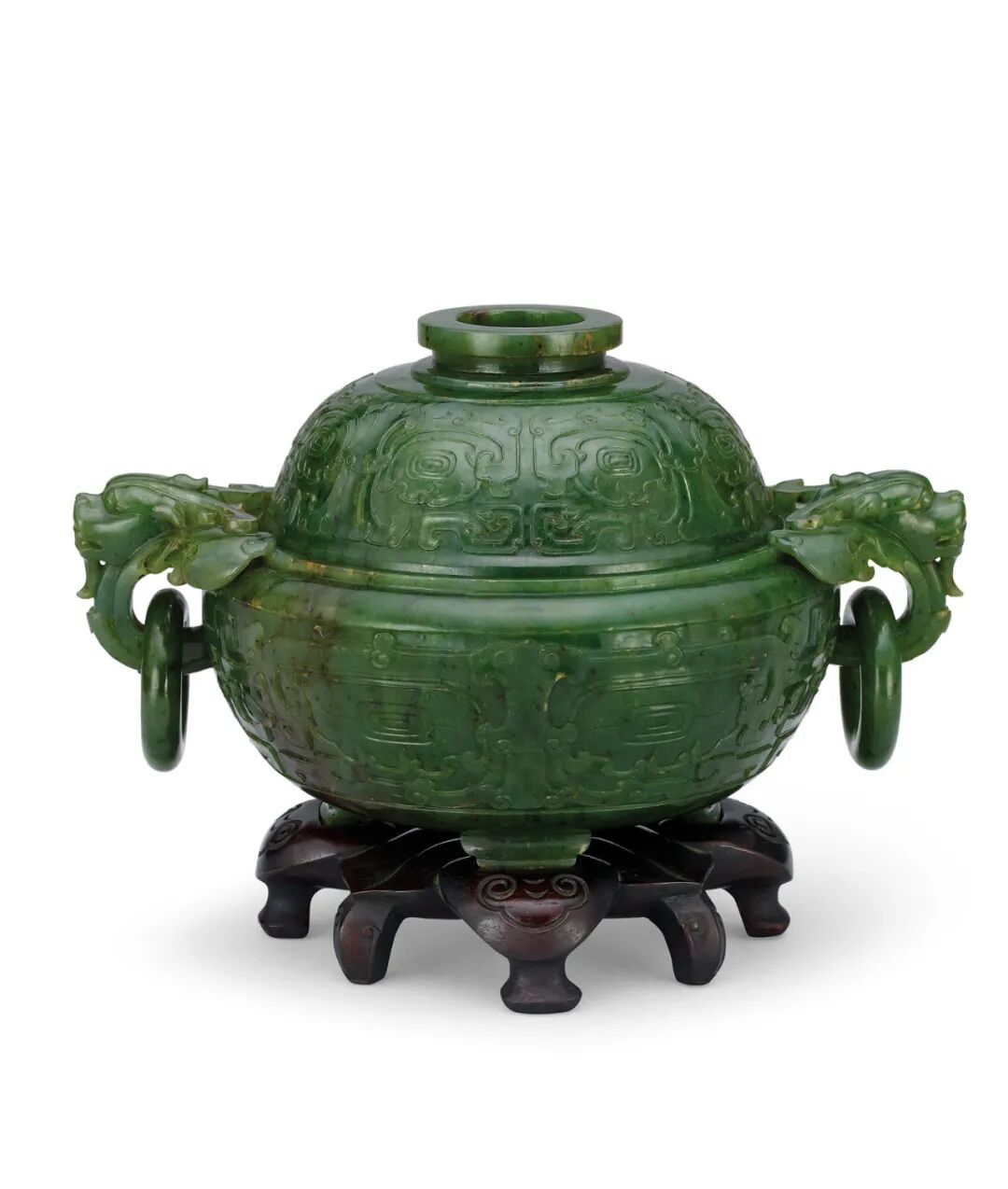 拍品估价:950,000 - 1,200,000 新台币炉以整料碧玉雕成,翠色满盈,散发莹莹宝光,翠绿中略含黑褐色斑点。器分盖与炉,子母口内扣相合。盖作覆碗貌,捉手呈短柱状,盖面浮雕变形兽面纹,纹饰繁缛精细,庄严肃穆。炉圆口,丰肩,圆腹,腹下渐收,下承四足。腹外壁亦雕兽面纹与盖呼应,两侧镂雕龙首,下置活环耳,呈现恢弘神威。整体造形凝练沉稳,雕刻技法纯熟,磨工细润,展现乾隆朝之艺术风格。