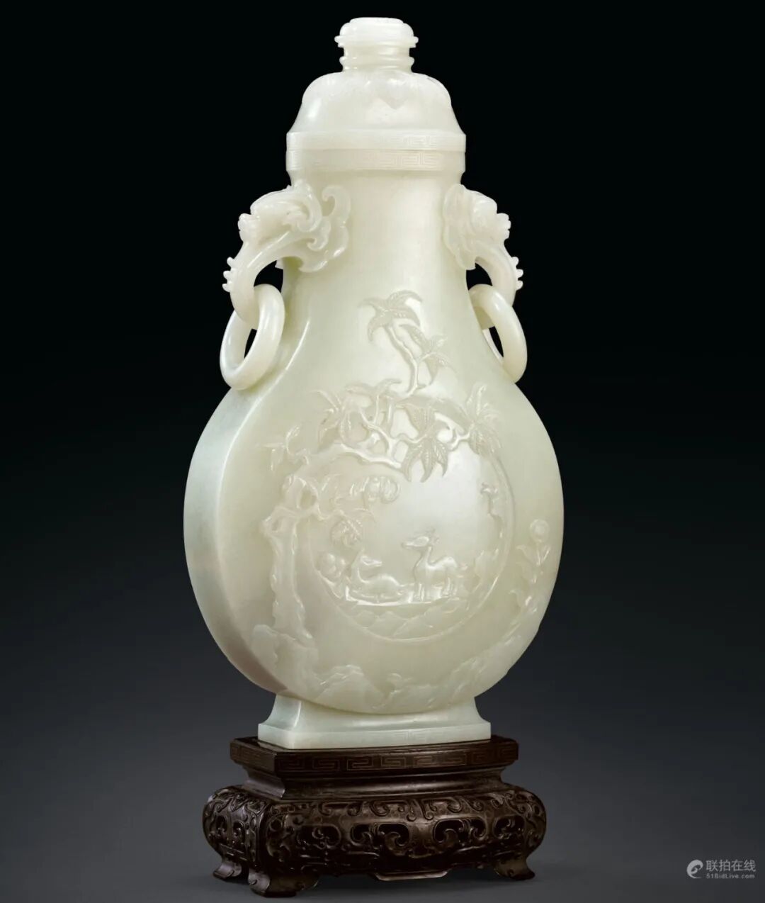 Lot112 十八世纪 白玉鹤鹿同春双夔龙耳活环盖瓶拍品估价:3,000,000 - 3,500,000 新台币1.密执安州霍兰市 John R. and Rose Meengs 伉俪收藏;瓶慎选整料上乘白玉雕琢而成,质纯净温润,色泽光雅。口呈椭圆状,束颈溜肩,扁圆腹,下承长方形外撇圈足。盖顶圆雕坛钮,钮下装饰蕉叶纹一周,上下口沿各饰一周雷纹。颈肩相交处镂雕对称夔龙首为耳,下衔活环。腹部两面近底处皆浅浮雕山峰起伏重迭,分别以苍松、仙芝以及柞树、秋菊相对应,藤蔓、枝叶转折攀延,形如满月开光,景物与月色相融,呈现国泰民安的盛世景象。壶腹开光画面中苍松遒劲,挺然独秀。下方福山寿海,开光中青翠柞树耸立,嫩叶鲜翠,蝙蝠飞翔,生机盎然。底处仙山连绵,双瑞鹿回首相望,悠然徜徉于飘浮祥云之间,生机盎然,仿如太平盛世之仙境。另面一对仙鹤停留山顶,或仰首曲颈眺望,或长颈下弯凝视,仙气萦绕,为清代宫廷祝寿的重要陈设器。