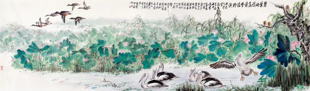 《碧叶映娇花》一作是其后期的一件重要作品,为2012年江苏美术馆举办的萧平先生七十岁美术大展中的一号展品。他运用大写意的手法,流畅的线条以及和谐的构图塑造了水天一色的景象,远处以淡墨平铺,更添辽阔之意。通观全作,画面中彩与墨相互交融,整体氛围浑厚丰满而不失情致意趣,细部的刻画同样耐人寻味。几只白鹳戏水于湖中,一群苍鹭飞于天际,映衬着满池的碧叶娇花更添底蕴,而树上站立嬉戏的几只小雀更为画面增添了几分活泼生动的意趣。