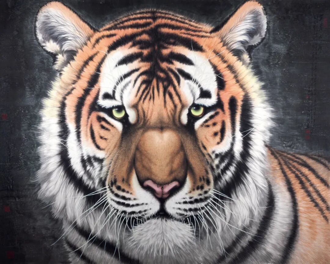 虎为百兽之王,自古以来备受人尊崇。孟祥顺擅画虎,他把虎静化、柔化,在静态的造型上和形体的转折中内涵着力。在威猛与柔静之间,在整体气势与精谨表现之间体现着对立统一的辩证关系。孟祥顺把工笔画之工推向了极致,但感觉上却很超逸轻松,令人叹为观止。且“虎”、“福”谐音,故古人以虎为福。