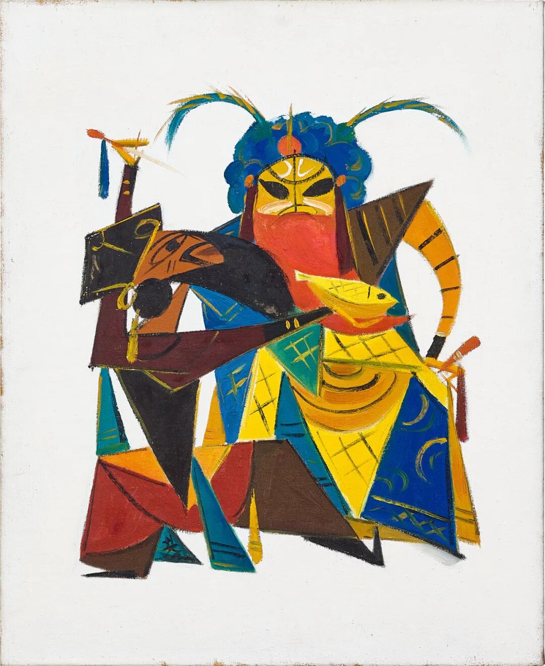 而林风眠创新的表现手法不仅仅体现在「中国戏曲系列」,在他的静物画作中也可见一斑。若说米罗的创作风格是用抽象构图诠释具象主题,林风眠的风格则是用抽象元素解析具象主题。《白色茶壶与静物》画中现实结构被拆解并重组,体现出艺术家对立体主义的摄取与升华。