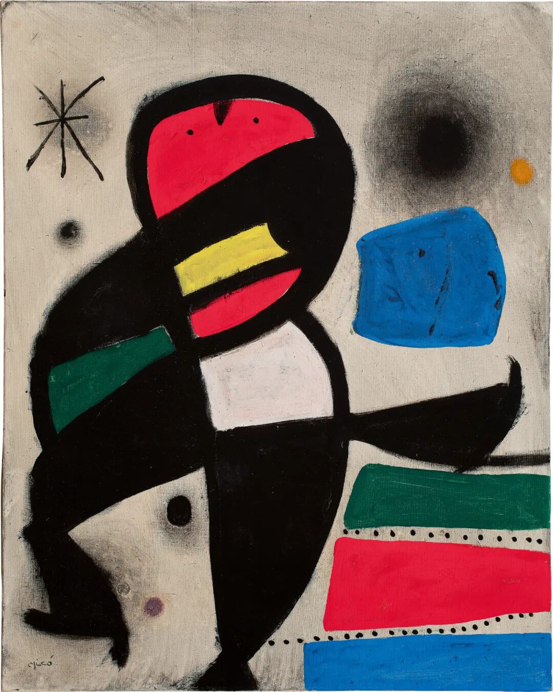 《星空漫步》是西班牙艺术家胡安·米罗(Joan Miro)晚年的杰出佳作,展现其娴熟的绘画技法以及在具象与抽象艺术边缘游走的风格。米罗在此作中运用缤纷色彩以及几何图案描绘出一幅人物在星空及月亮下悠然漫步的愉快情景。人、鸟、星空是米罗早在一九四〇年代创作的「星座」系列中便成为重要题材。《星空漫步》作于一九八〇年,可见艺术家晚年在创作方面的成长,也反映出他艺术生涯中受到的种种影响。本作浓缩 了米罗数十年的重要创作元素,各种形状和色彩展现出悠扬的情感,完美融合具象主题和抽象构图。《星空漫步》将会是胡安油画作品中首次登上亚洲拍场的作品,实属可贵。