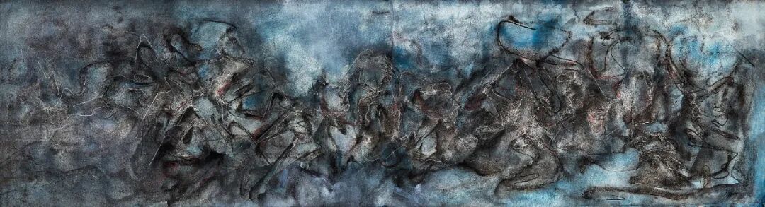 《无题》是谢景兰抽象绘画的典例之一,此巨幅水墨纸本采用中国书法的横轴散点透视,随着视角的不断变幻,风景也随即变化。这种不受固定视角限制的艺术效果与纯抽象的绘画语言使得艺术家的作品既摆脱了传统山水画的约束,又为抽象创作增添了新的理解方式。
