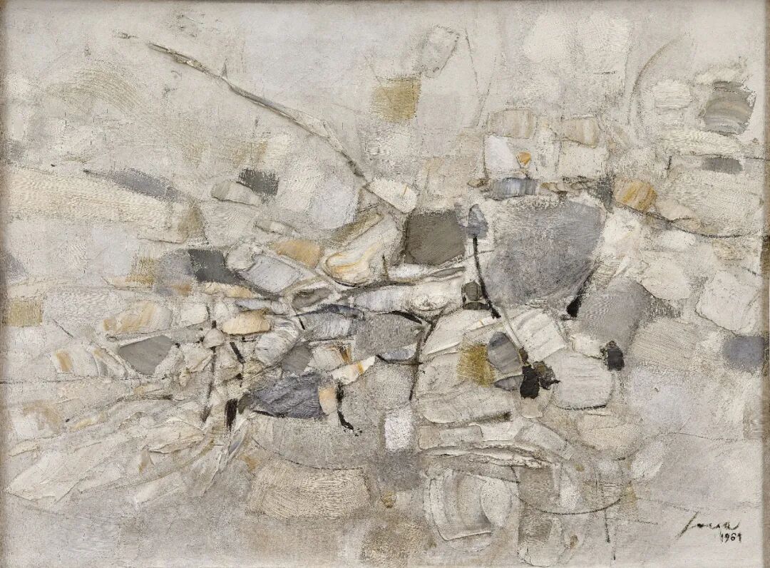 赵无极以外,另一位与米罗有深刻交流的华人艺术家便是林寿宇。米罗于林寿宇曾同属同一代理画廊:马勃洛画廊(Marlborough Gallery),而米罗在首次见到林寿宇的画作时深受感慨,并留下一句流传至今的赞语:「在白色的世界里,你无人能及。」《绘画浮雕 13.9.1962》正是林寿宇抽象创作的代表作之一。看似单调的白色画布上,艺术家其实精巧地涂绘了一层又一层的颜料,细腻地谱出层次丰富的白色,在平面的画布上创作出玄妙的空间。