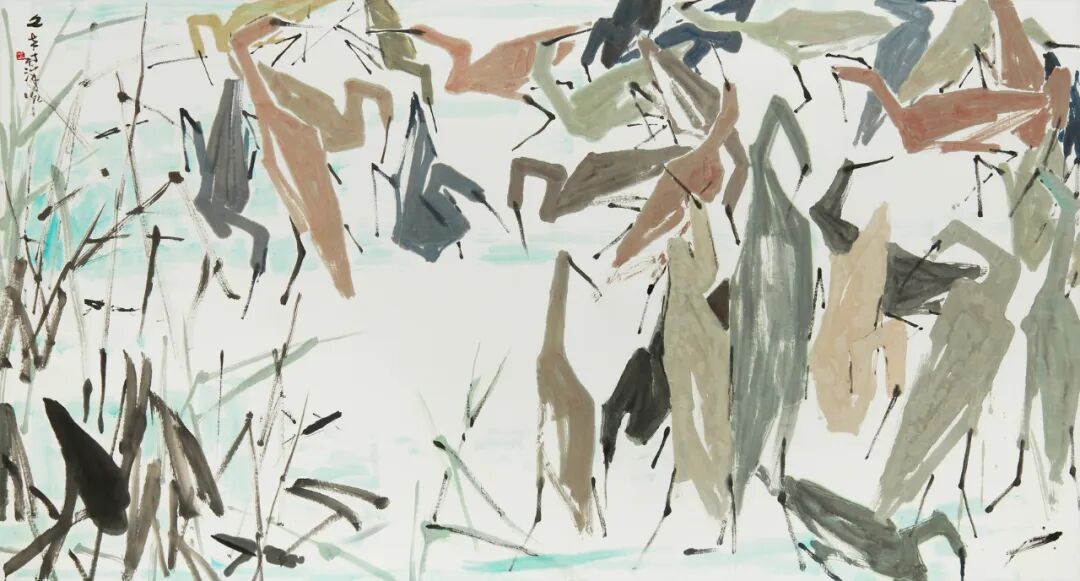 陈文希是现代南洋先锋艺术代表性人物之一,他的水墨画充分融合了水墨创作的标志特色和立体派美学的特征。鸟类是陈文希画作中常出现的主题之一,而在创作鹭鸶主题的画作时,艺术家常常使用近乎抽象的表达手法;他简化了白鹭的造型,将白鹭身体和颈部的线条菱角放大,用简练的几何图形在画面一伸一展,让人体会到白鹭动作的机灵敏捷。