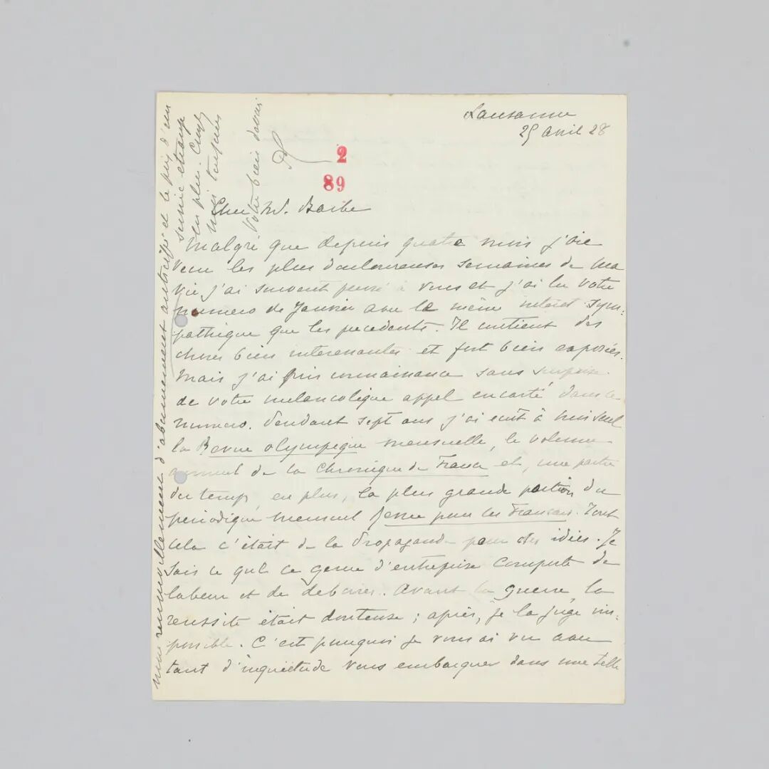 信札通篇亲笔,二页,法语,作于奥委会所在地,亦是作者后来的安息地瑞士洛桑,信笺首页左上角署有本款“P.C.”。顾拜旦已于1925年荣休并卸任国际奥委会委员和主席,仅保留荣誉主席身份。
