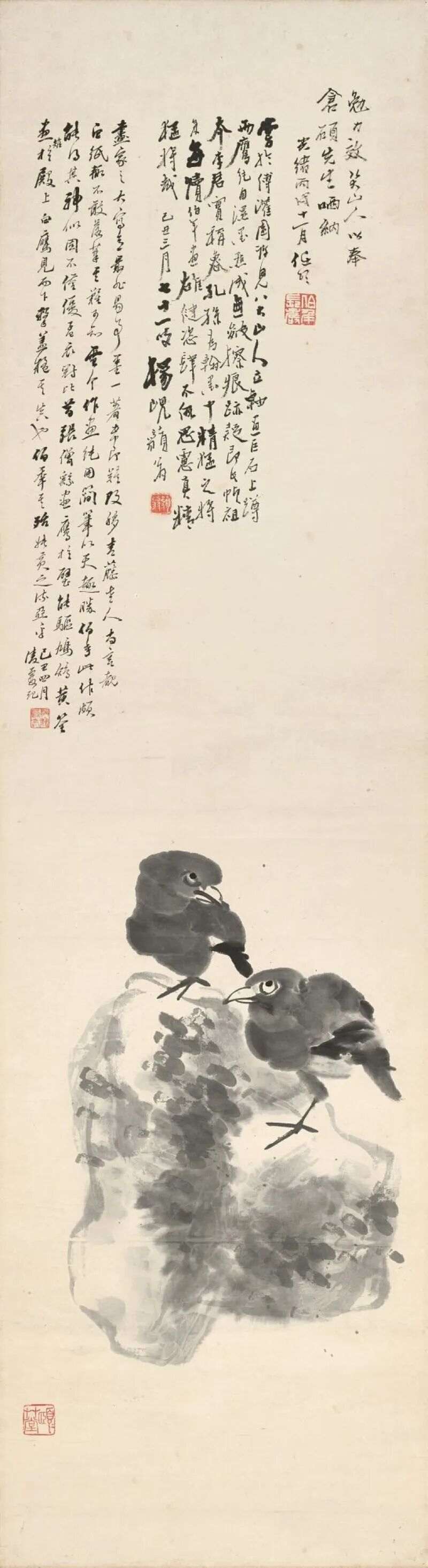 〈杨〉尝于傅灌园得见八大山人立轴,画巨石,上蹲两鹰,纯用湿墨点成,无皴擦痕迹,疑即此帧祖本。李君实称鲁孔孙为翰墨中精猛之将。余每读伯年画,雄健恣肆,不假思虑,真精猛将哉。己丑三月,七十一叟杨岘藐翁。