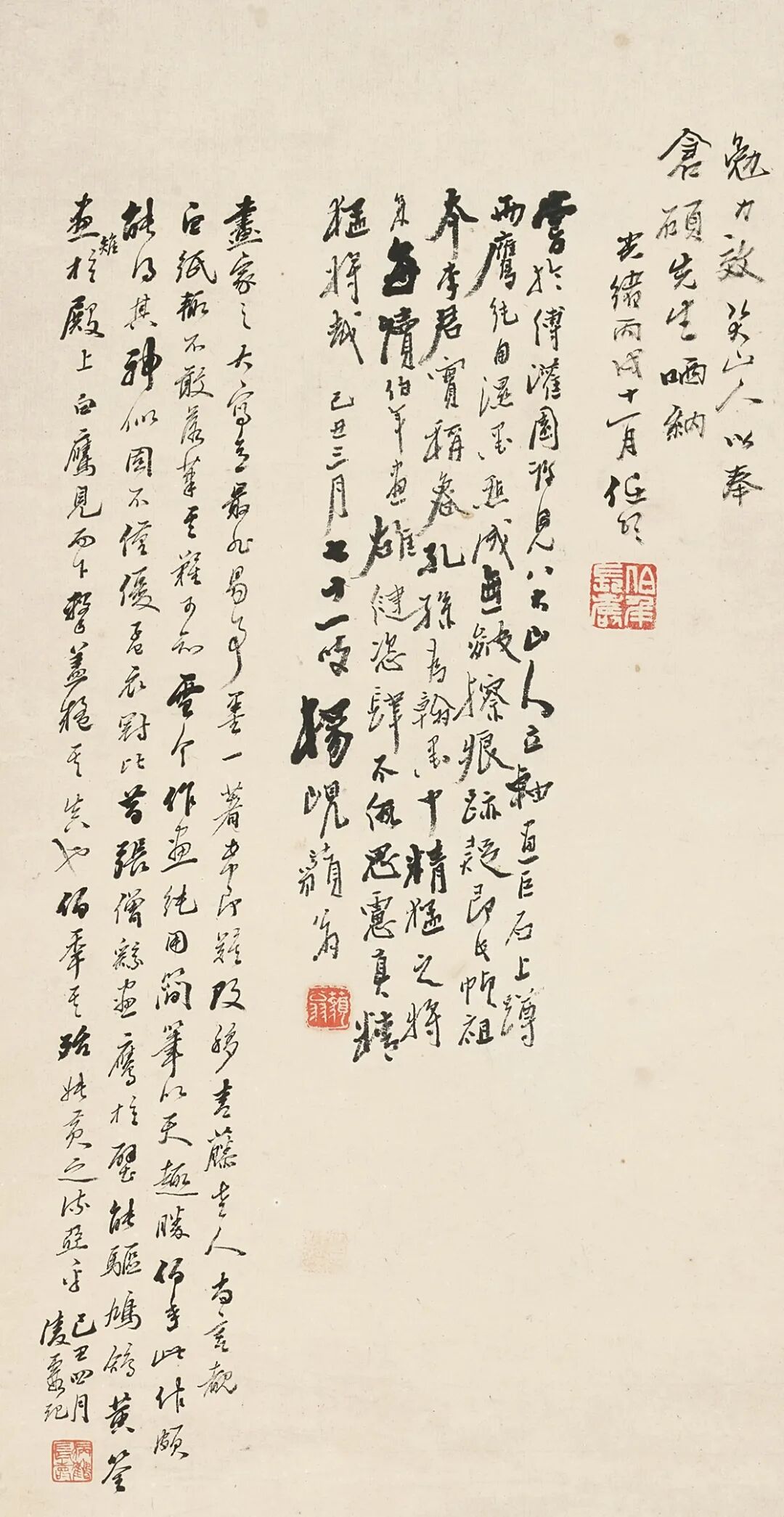本幅乃画家写赠书画同道吴昌硕。两人订交至迟于一八七九年,昌硕绘画尝得任氏指授,获益匪浅,其记契友的〈十二友诗〉,任伯年亦在其列。自订交至一八九五年任伯年谢世,他为吴昌硕作画甚夥,仅肖像可考者近十幅,传神阿堵,俱为得意之笔。一八八六年十一月,吴昌硕「薄游沪上」,贻任伯年「画奴」印,任氏为其写照〈饥看天图〉(杨岘题识),又作〈归田图〉,本幅亦出于同时。