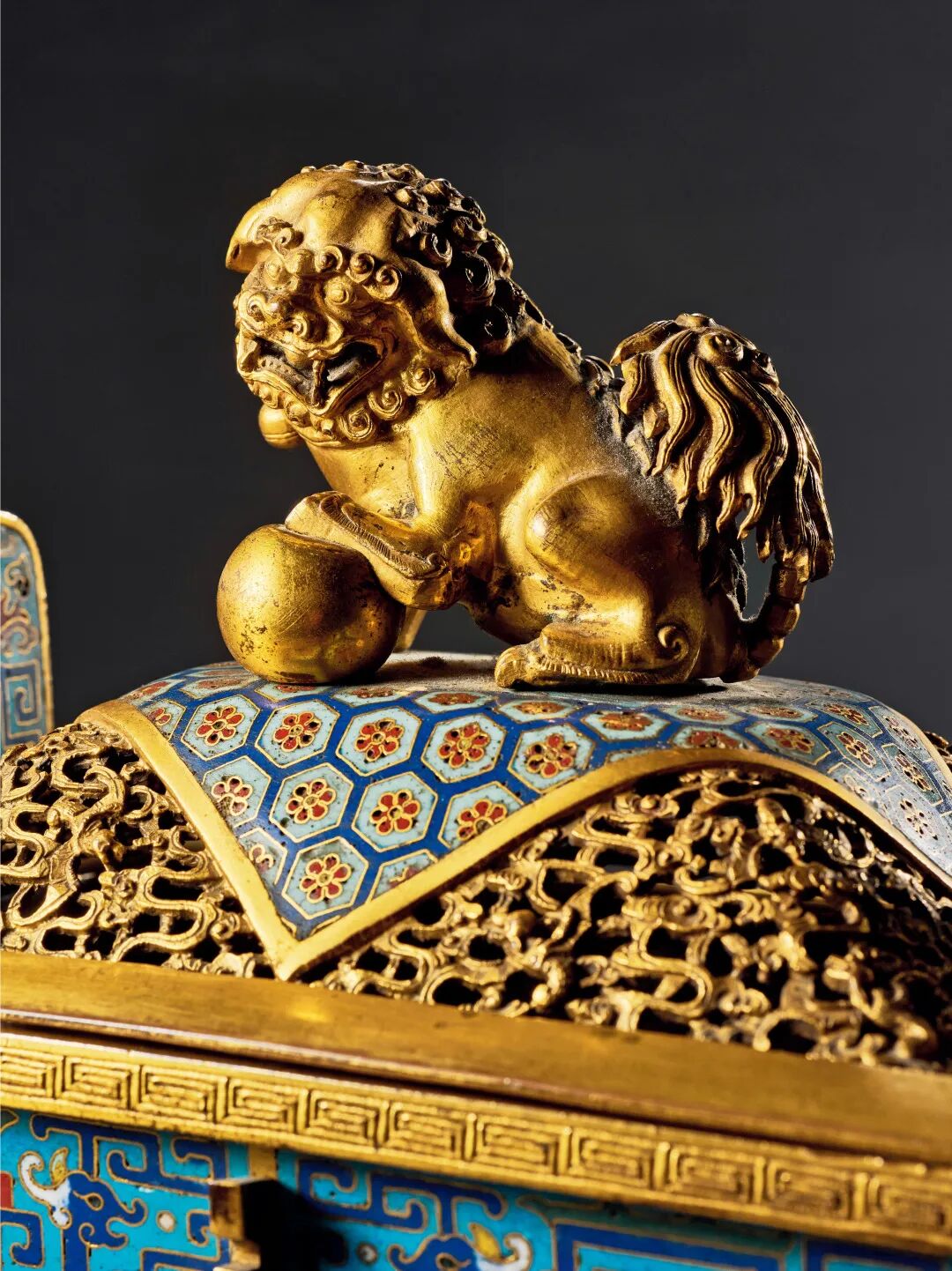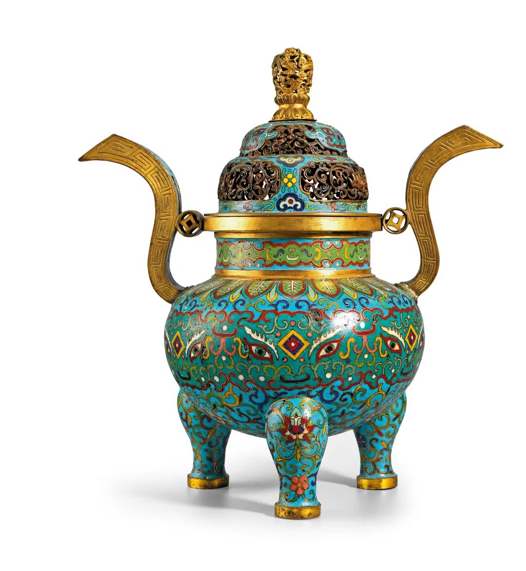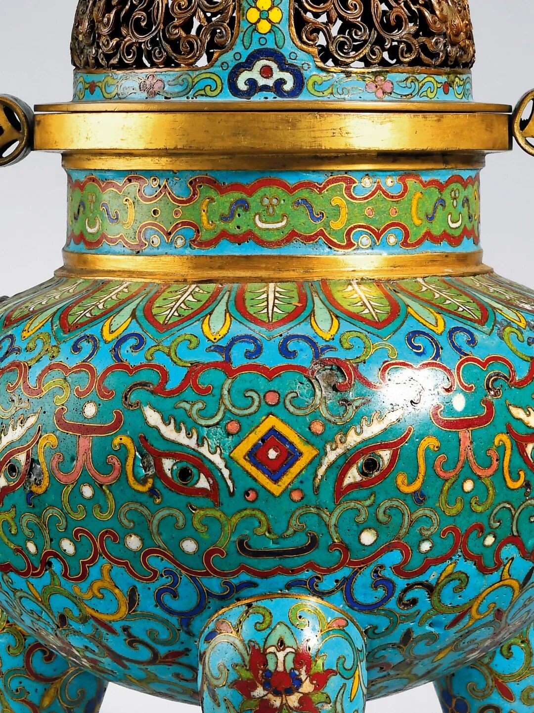 炉盖、炉身、炉底、三兽足等处都采用景泰蓝工艺制作地纹,其余处鎏金。炉盖与炉底、三兽足上的纹饰题材一致,缠枝莲、如意云头、宝相花错落有序分布,蓝、黄、红、绿诸色斑斓,相映成趣。炉身主体也是表现大象,绘制一圈间隔分布的象面纹。大象眼睛和眉毛上扬,神态慈祥,额间悬挂多彩华饰,彰显尊贵身份。