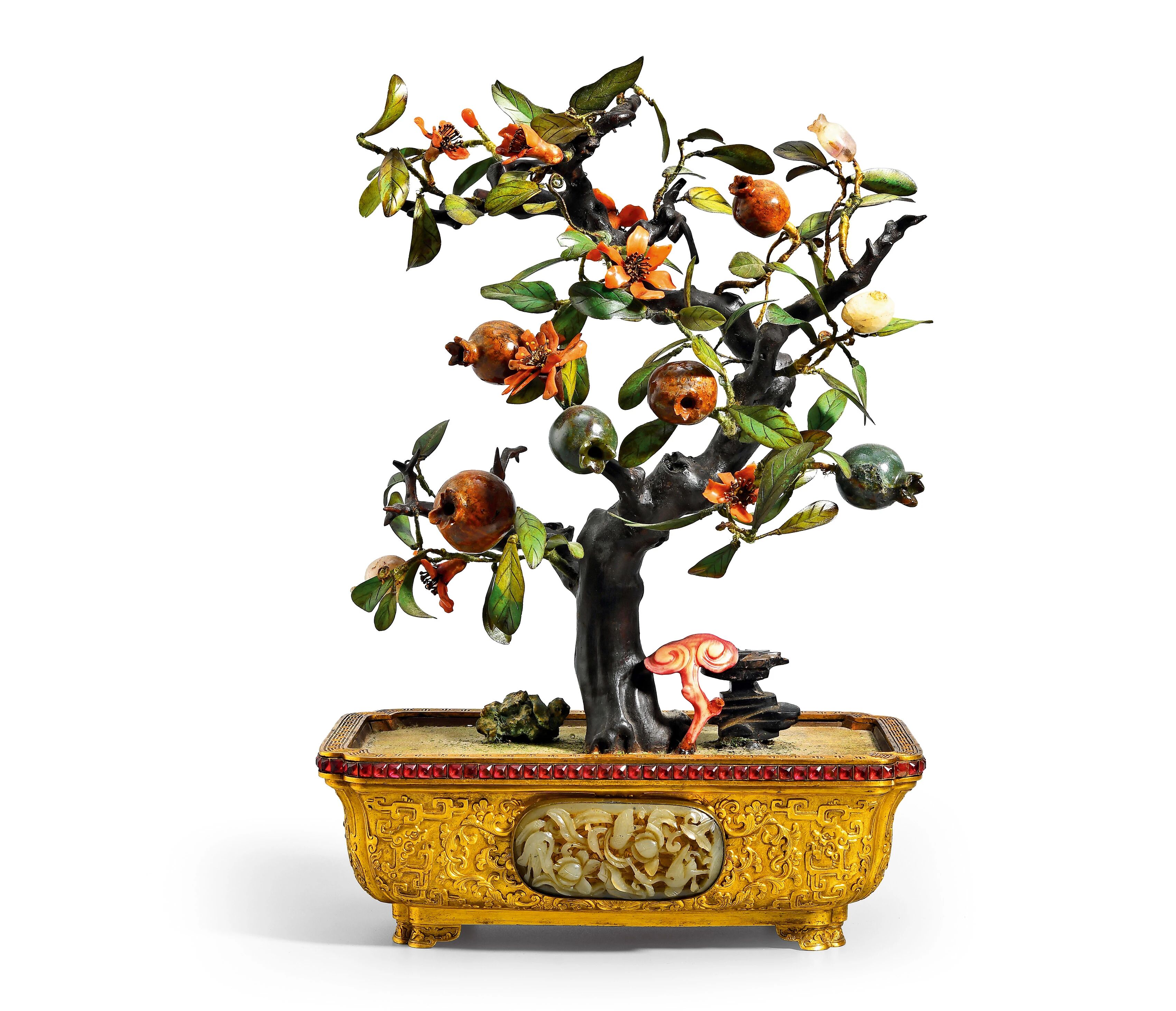 此式盆景在乾隆宫廷为颇受皇帝喜爱的珍玩雅设,活计档中即有记载:“传旨将此珠子、宝石、金刚石镶嵌盆景上用,钦此。”可见当时宫中多有珠玉宝石被用作镶嵌盆景之用。此类盆景多含吉祥寓意,在宫廷除用于日常陈设外,亦多为皇室成员之寿礼。如此件石榴盆景,满树石榴寓“榴开百子”,下方寿石灵芝又有富贵长寿之意,实为吉祥佳器。