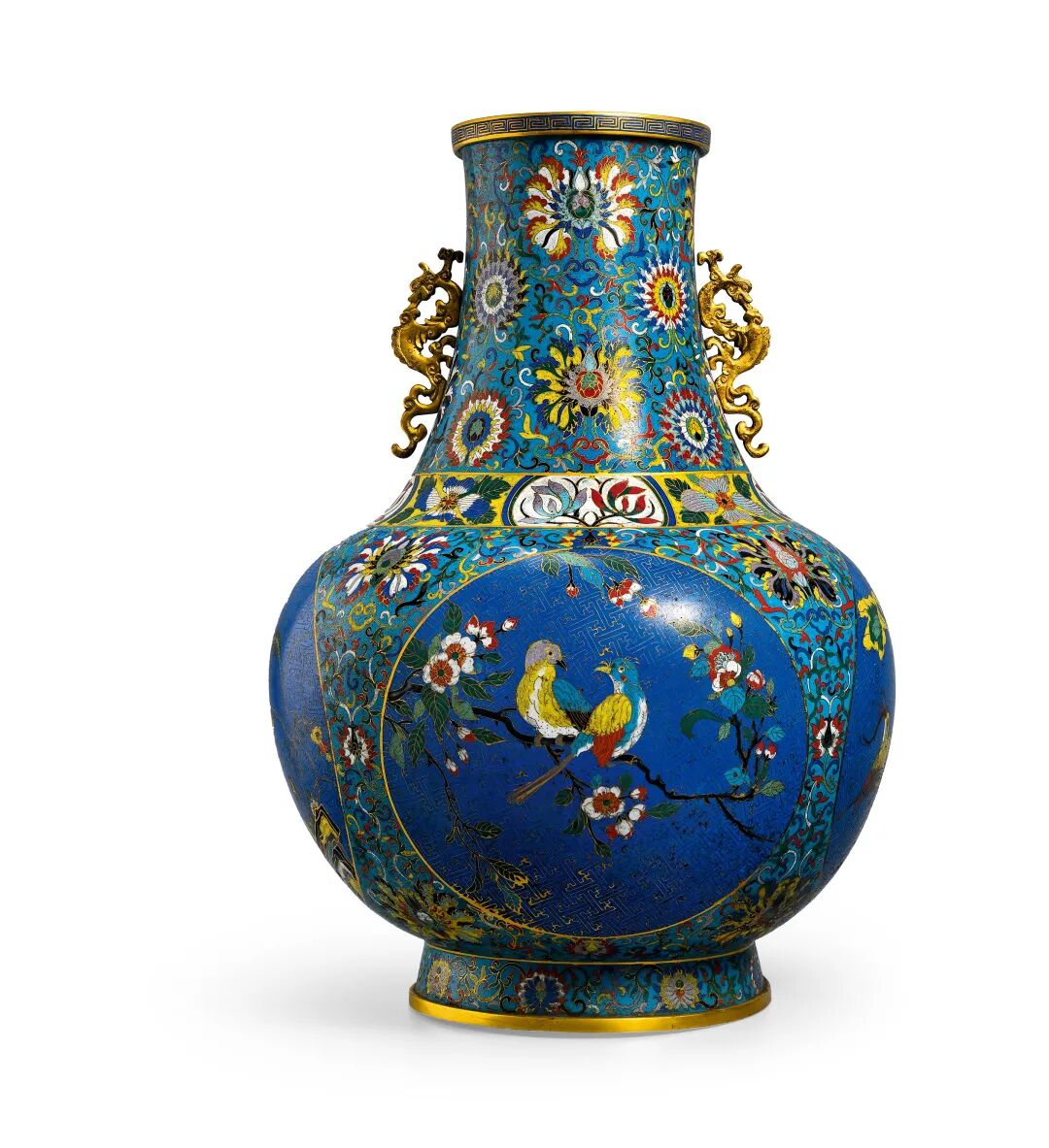 清乾隆掐丝珐琅花鸟开光天球瓶